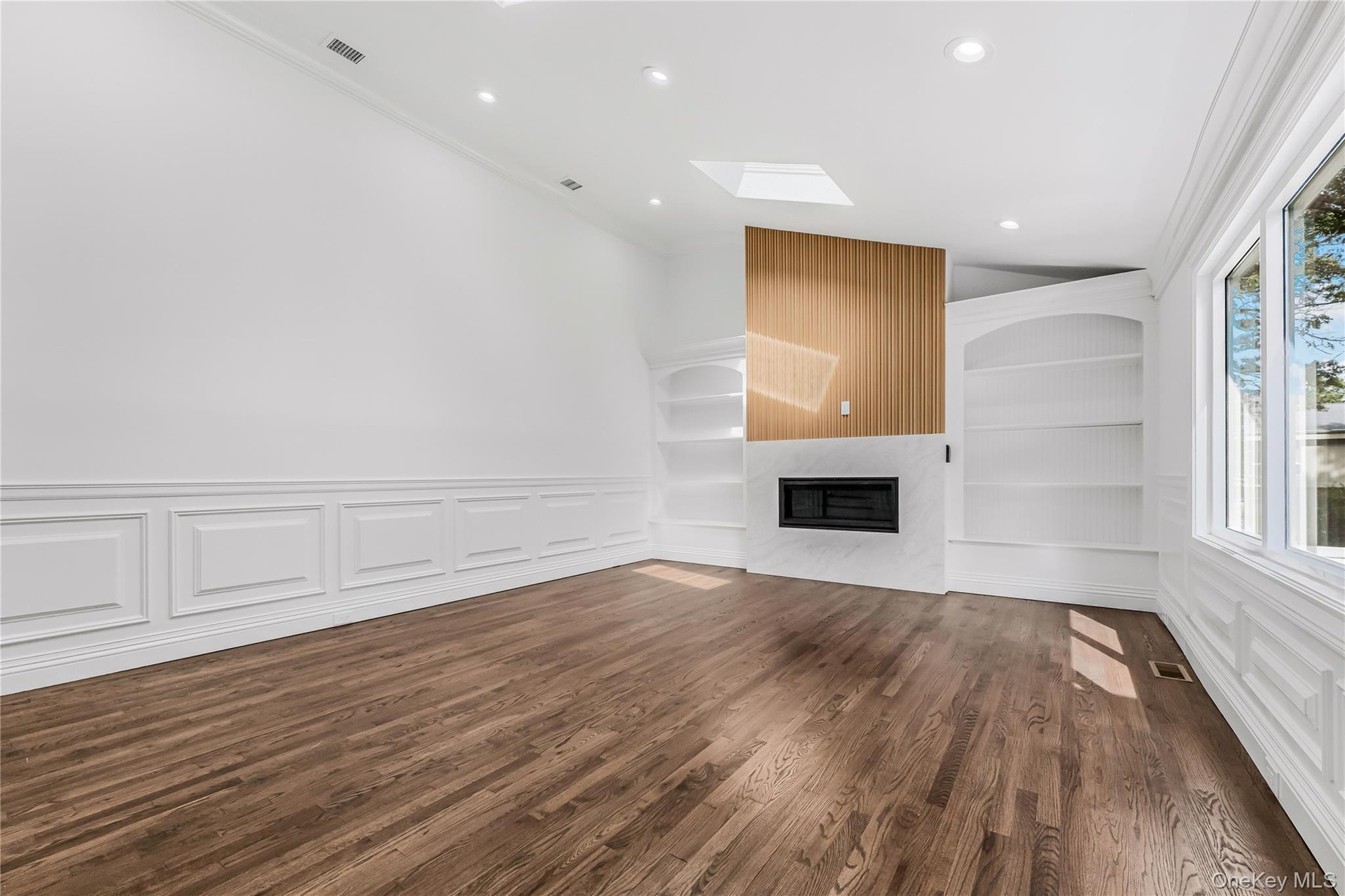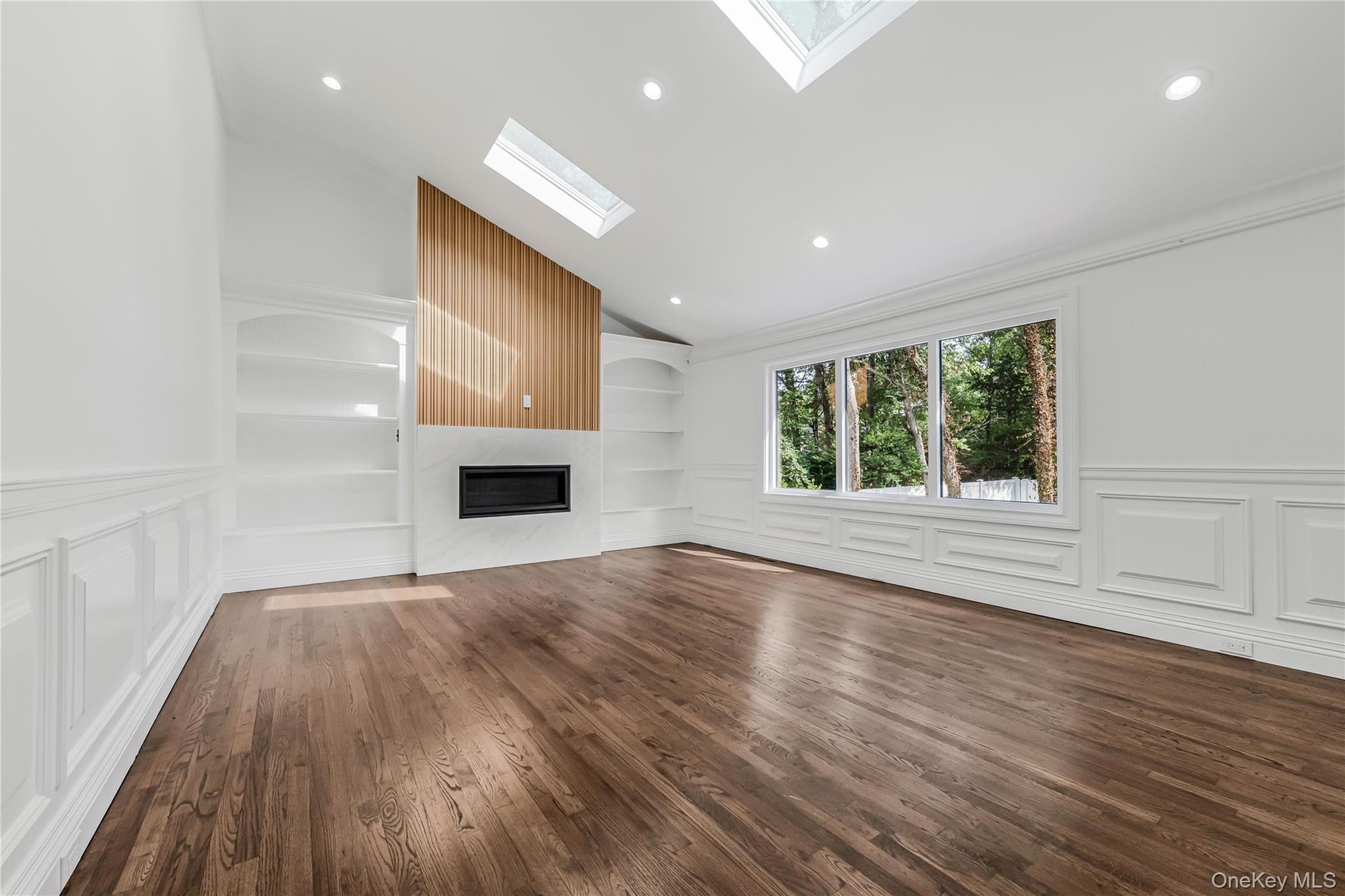 - Unfurnished living room featuring plenty of natural light, a skylight, a decorative wall, recessed lighting, and built in features