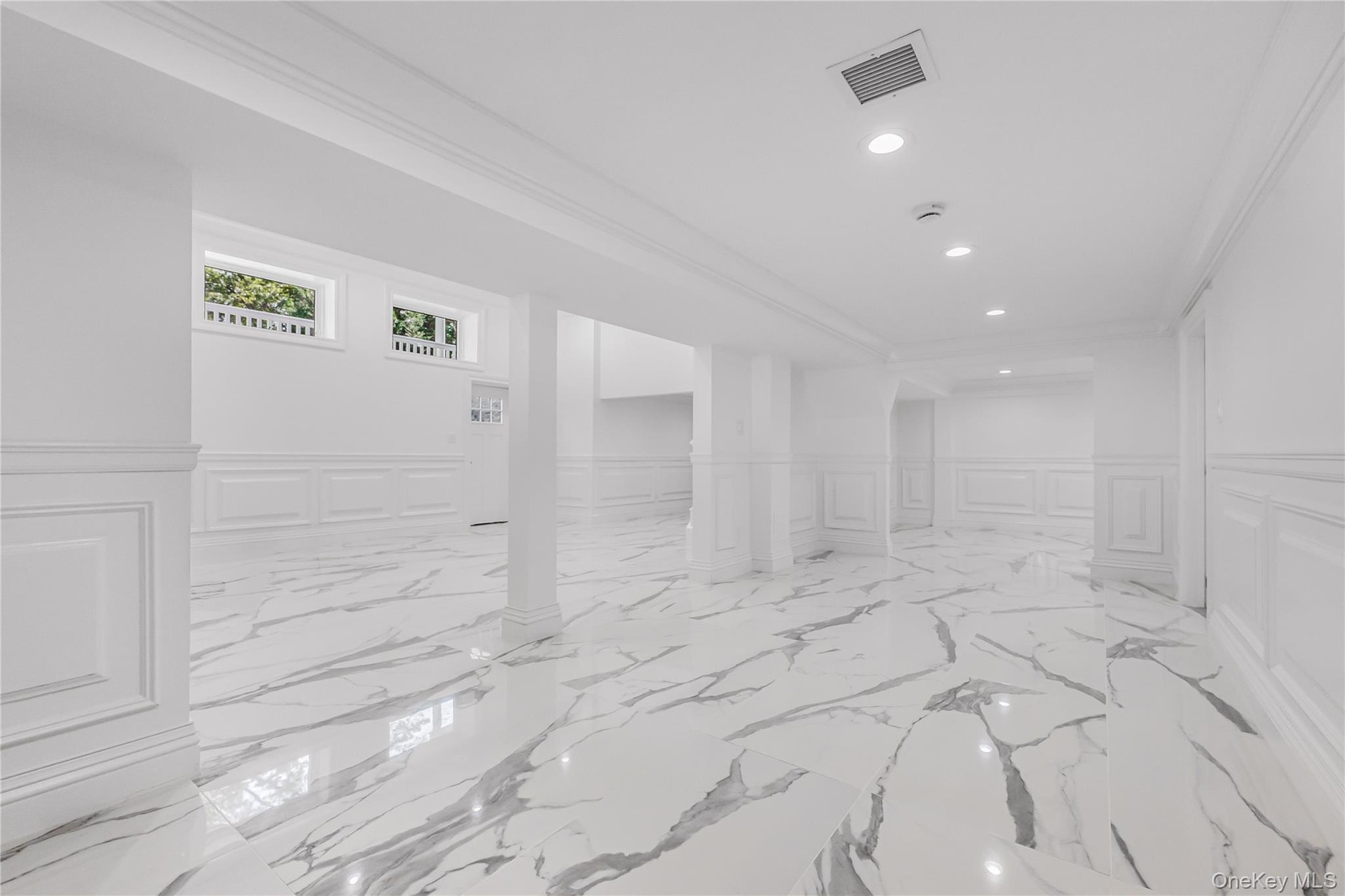 - Spare room with a wainscoted wall, a decorative wall, light marble finish flooring, recessed lighting, and ornamental molding