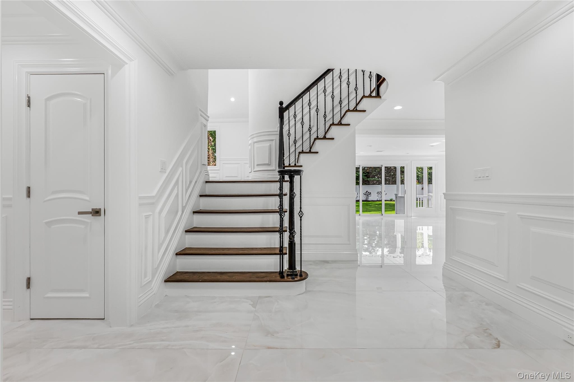 - Stairs with a decorative wall, crown molding, recessed lighting, wainscoting, and marble finish floors