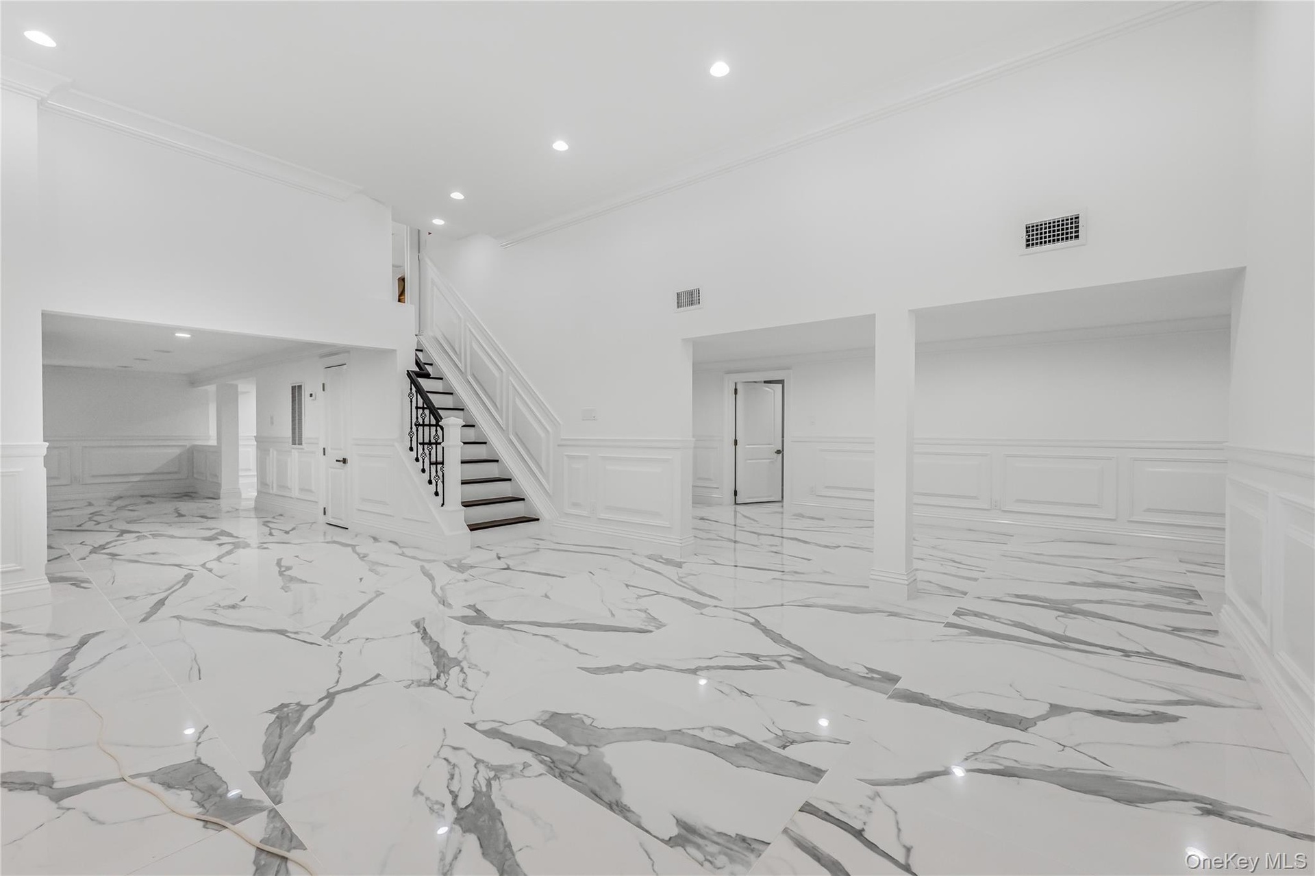 - Unfurnished living room featuring a decorative wall, light marble finish floors, recessed lighting, a high ceiling, and stairs