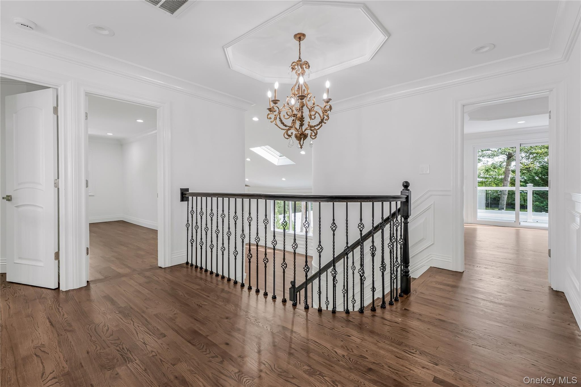 - Corridor featuring a chandelier, plenty of natural light, ornamental molding, dark wood-style flooring, and an upstairs landing