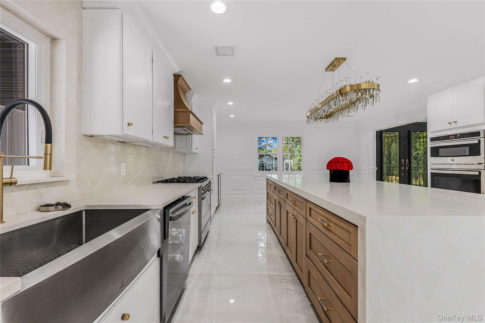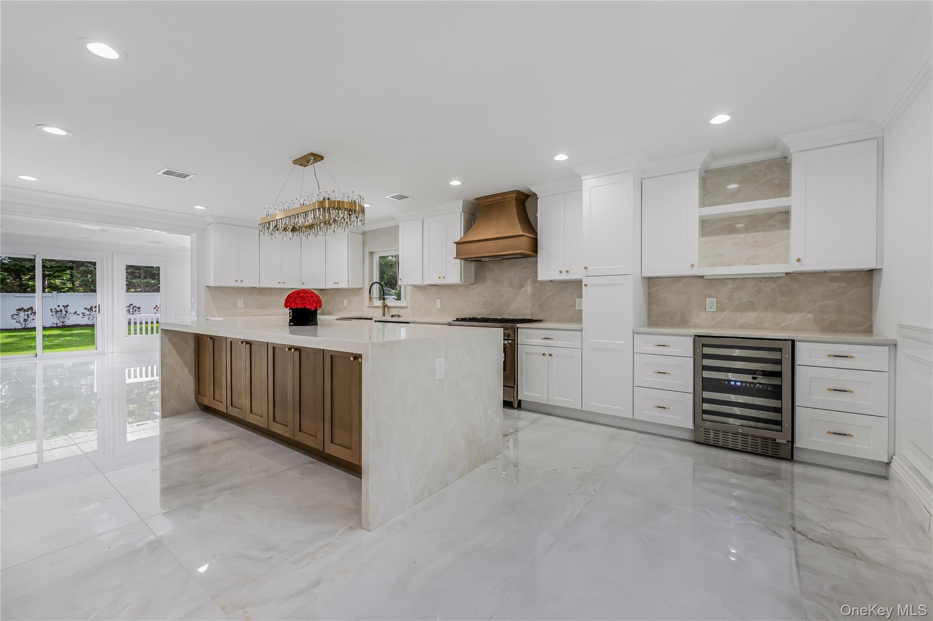 - Kitchen with light marble finish flooring, a chandelier, tasteful backsplash, light stone counters, and white cabinetry