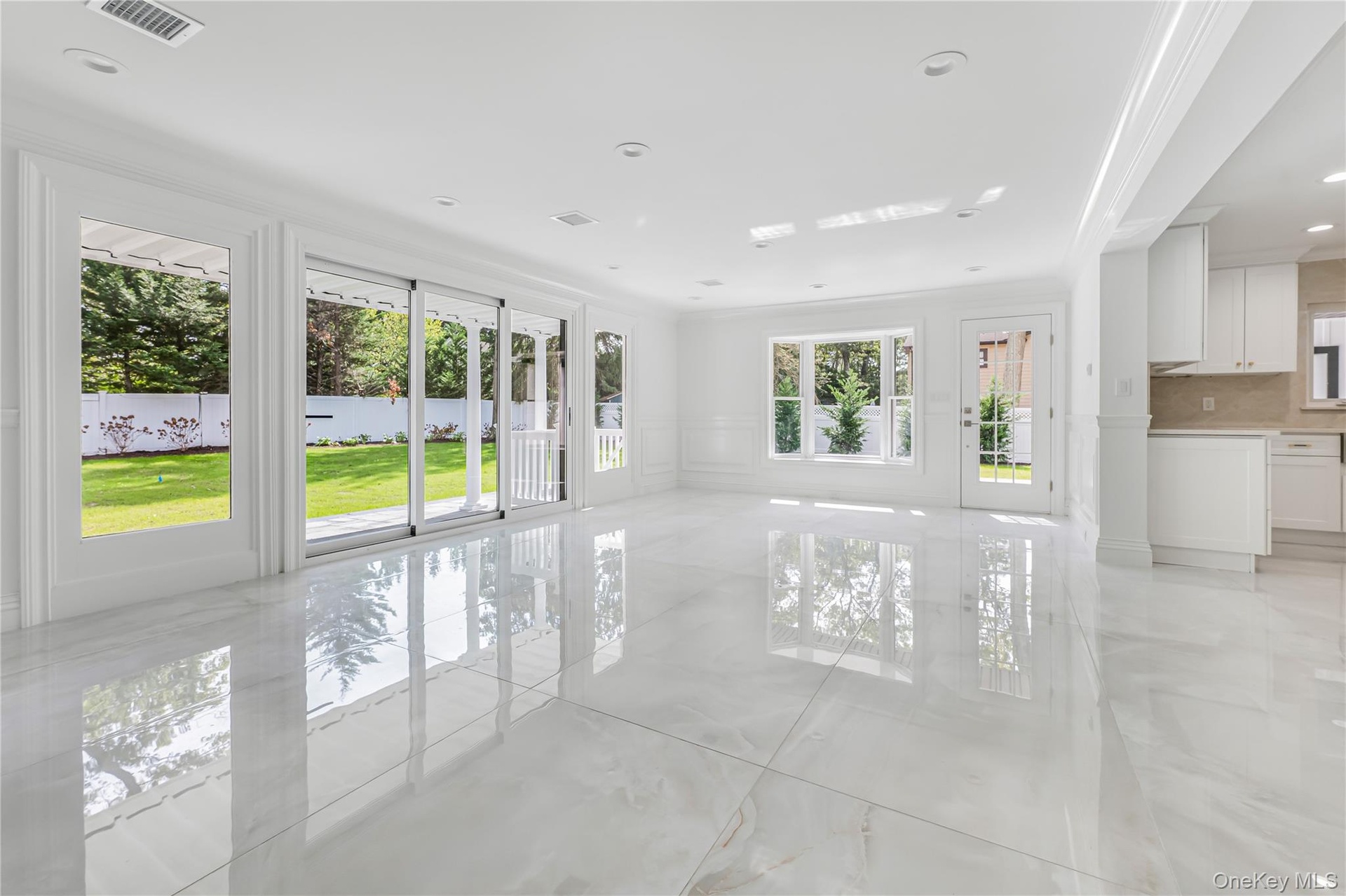 - Unfurnished living room featuring ornamental molding, light marble finish floors, and recessed lighting