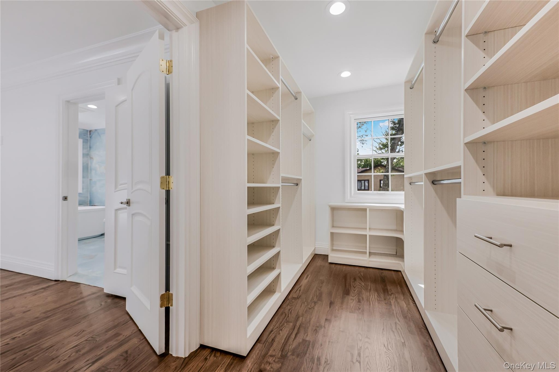 - Unfurnished bedroom with crown molding, ensuite bath, dark wood-style floors, recessed lighting, and a closet