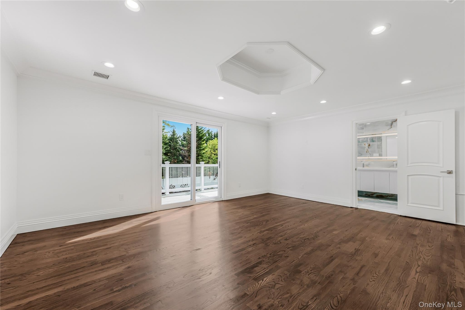 - Empty room with crown molding, dark wood-type flooring, and recessed lighting