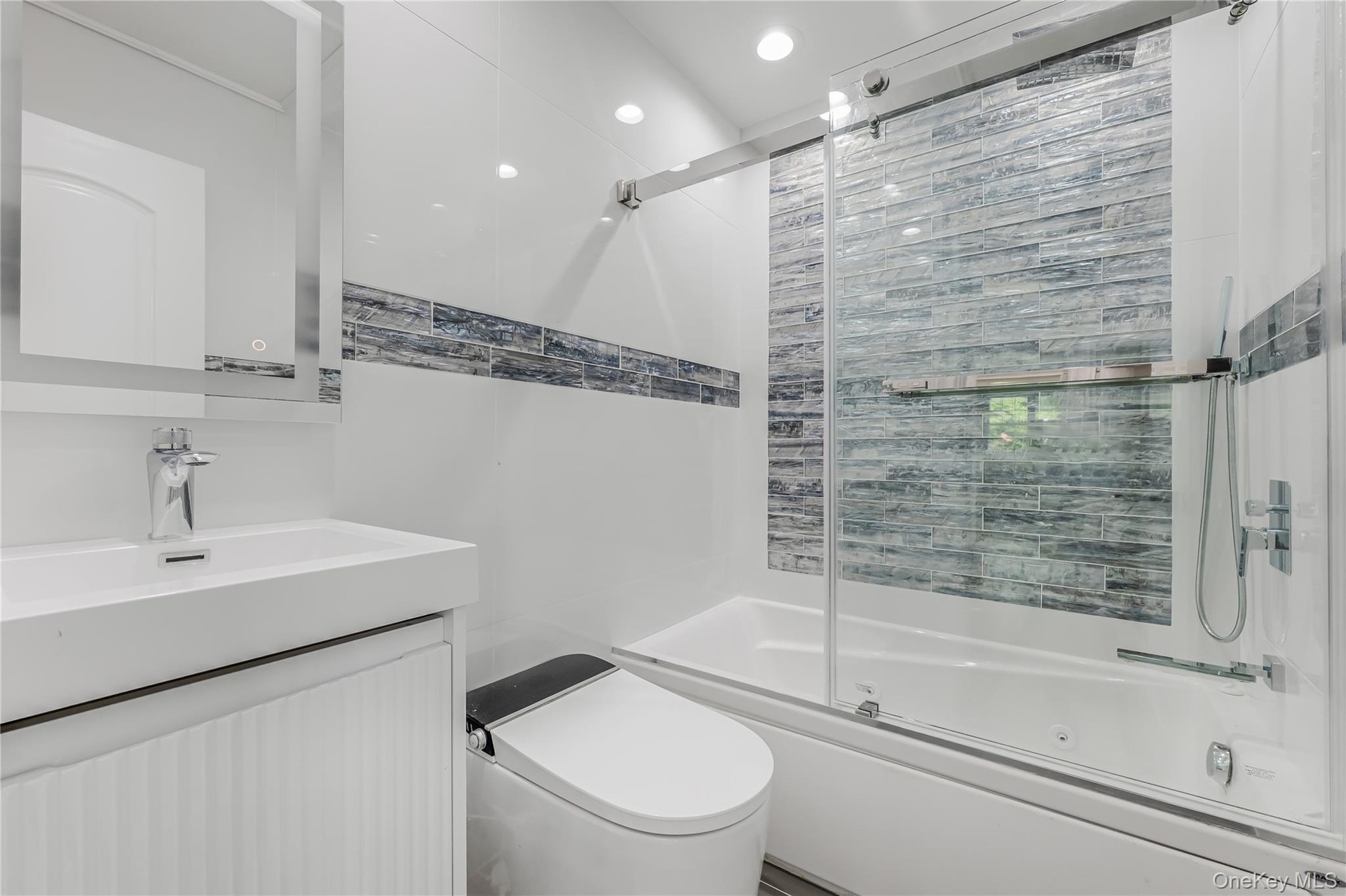 - Bathroom featuring enclosed tub / shower combo, vanity, and recessed lighting