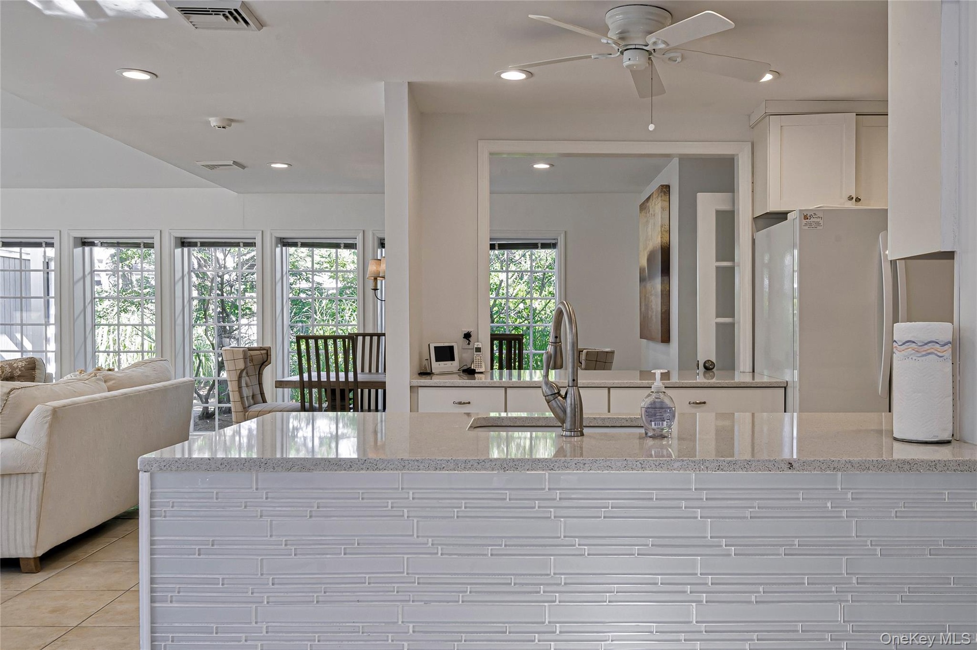 - Kitchen featuring white cabinetry, recessed lighting, light stone counters, a ceiling fan, and open floor plan