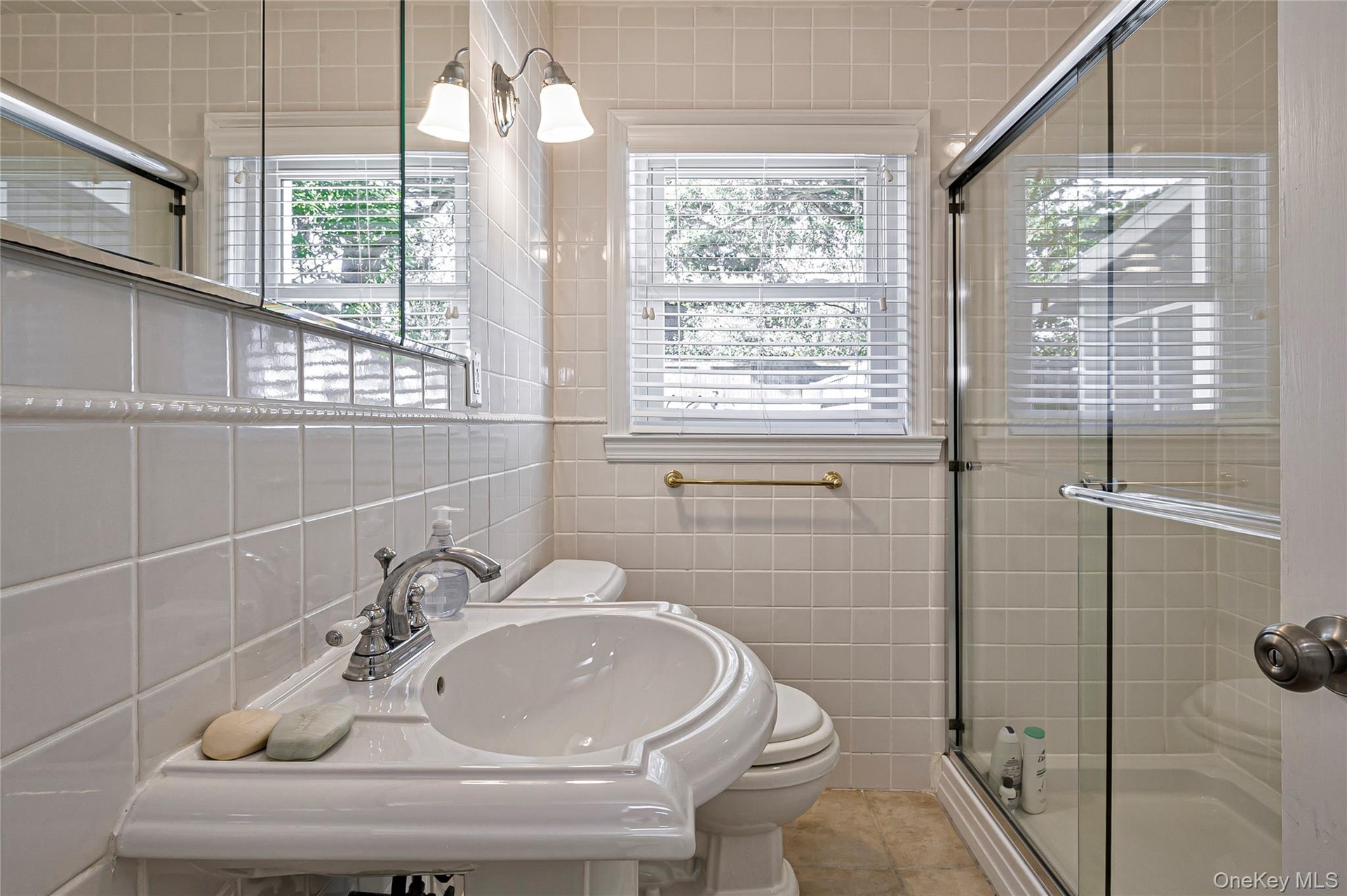 - Full bathroom with tile walls, a shower stall, and tile patterned floors