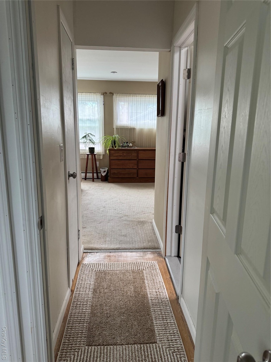- Hallway featuring carpet flooring and wood finished floors