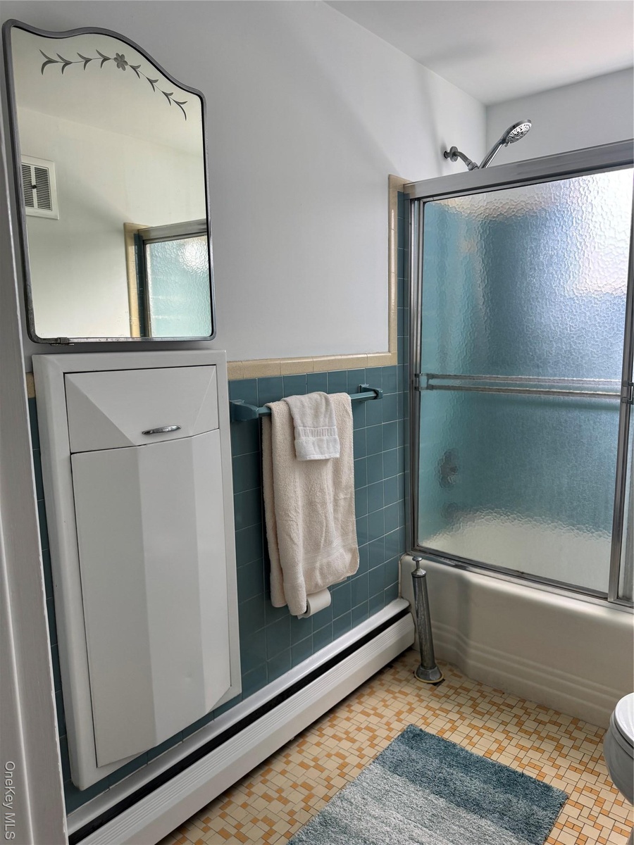 - Bathroom featuring a baseboard radiator, shower / bath combination with glass door, tile walls, light tile patterned flooring, and a wainscoted wall