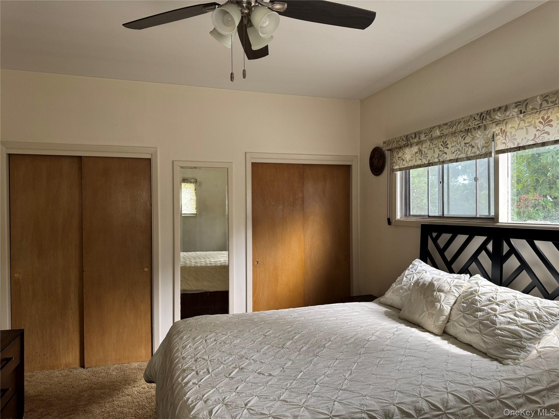 - Carpeted bedroom with multiple closets and a ceiling fan
