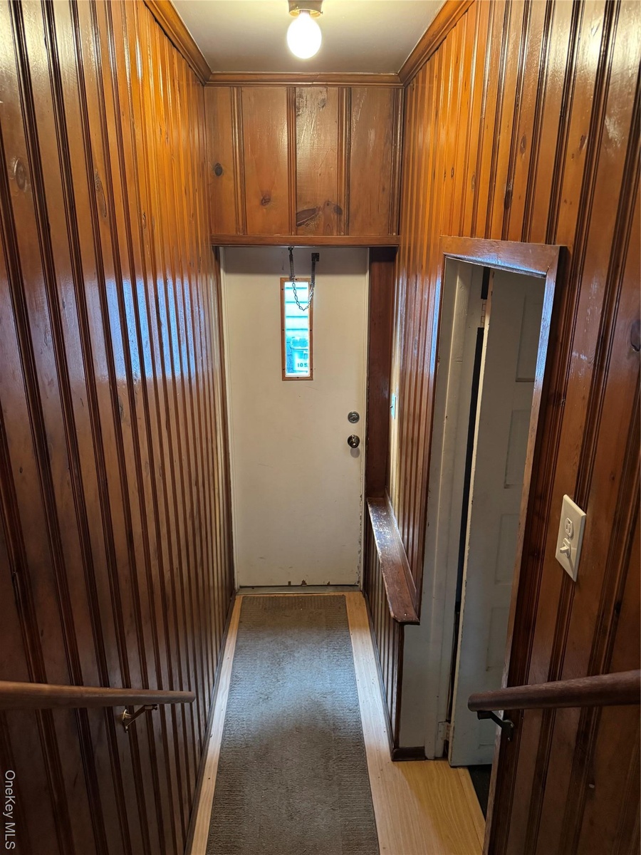 - Hallway with dark wood-style flooring