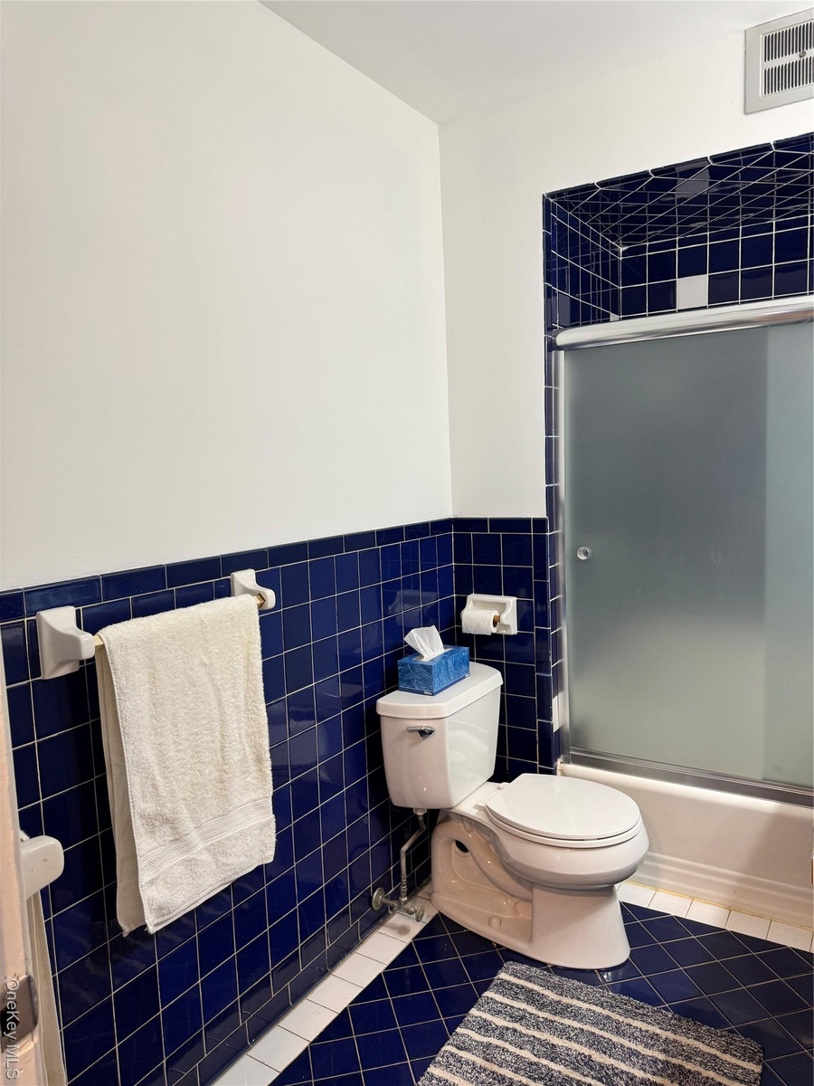 - Full bathroom with tile walls, tile patterned flooring, bath / shower combo with glass door, and wainscoting