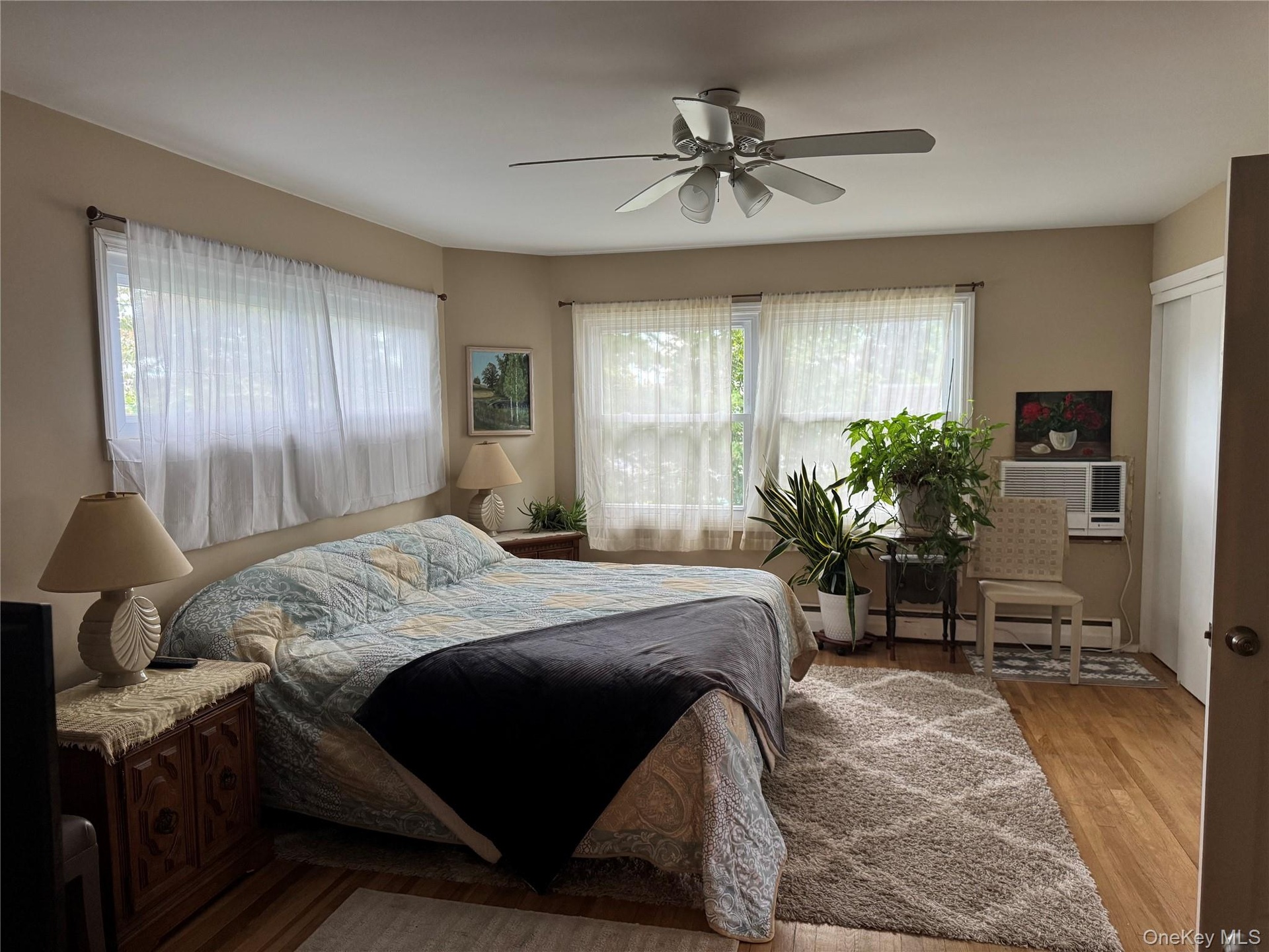 - Bedroom with multiple windows, wood finished floors, a ceiling fan, and a closet