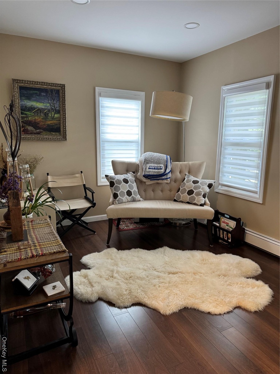 - Living room featuring dark wood finished floors and a baseboard radiator