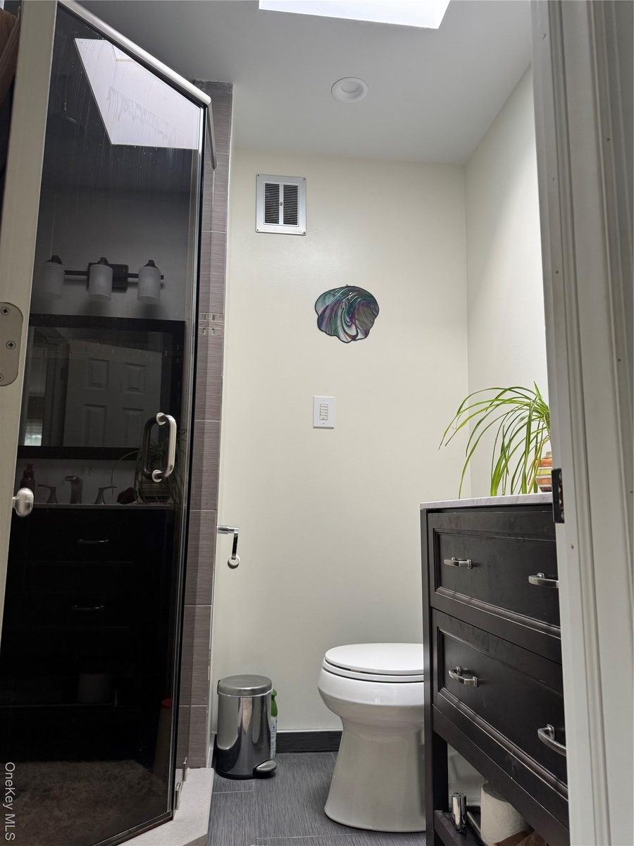 - Full bath featuring a shower stall and a skylight