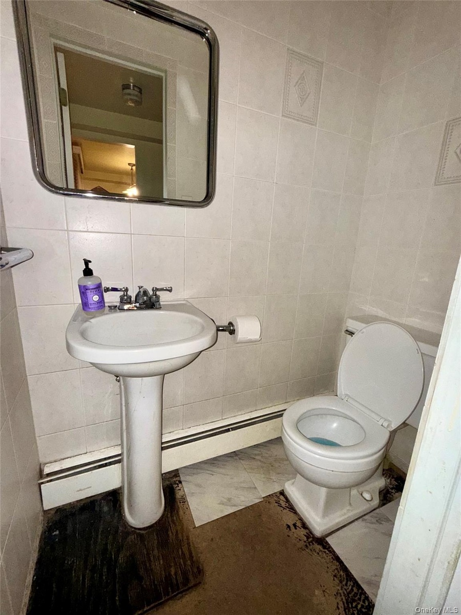 - Bathroom featuring a shower stall, a baseboard radiator, and tile patterned floors