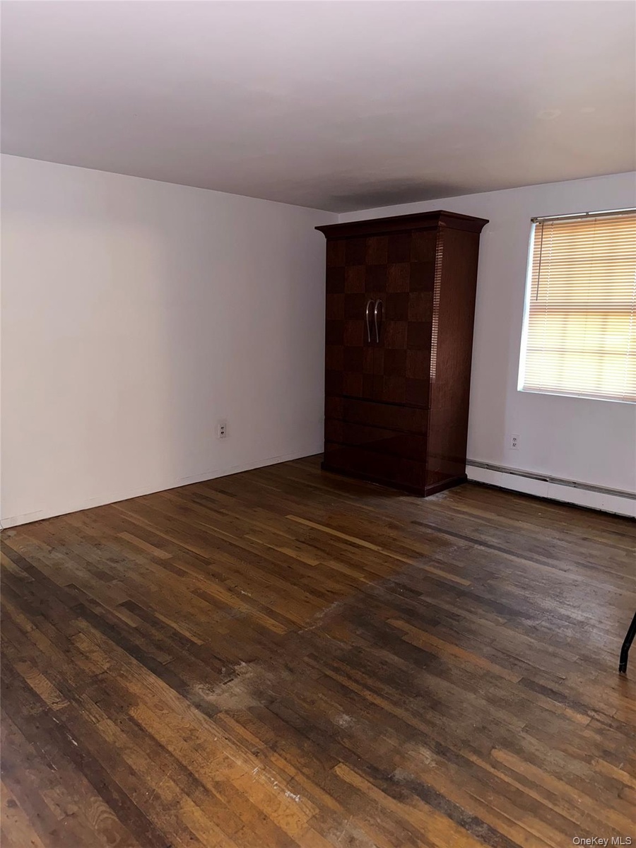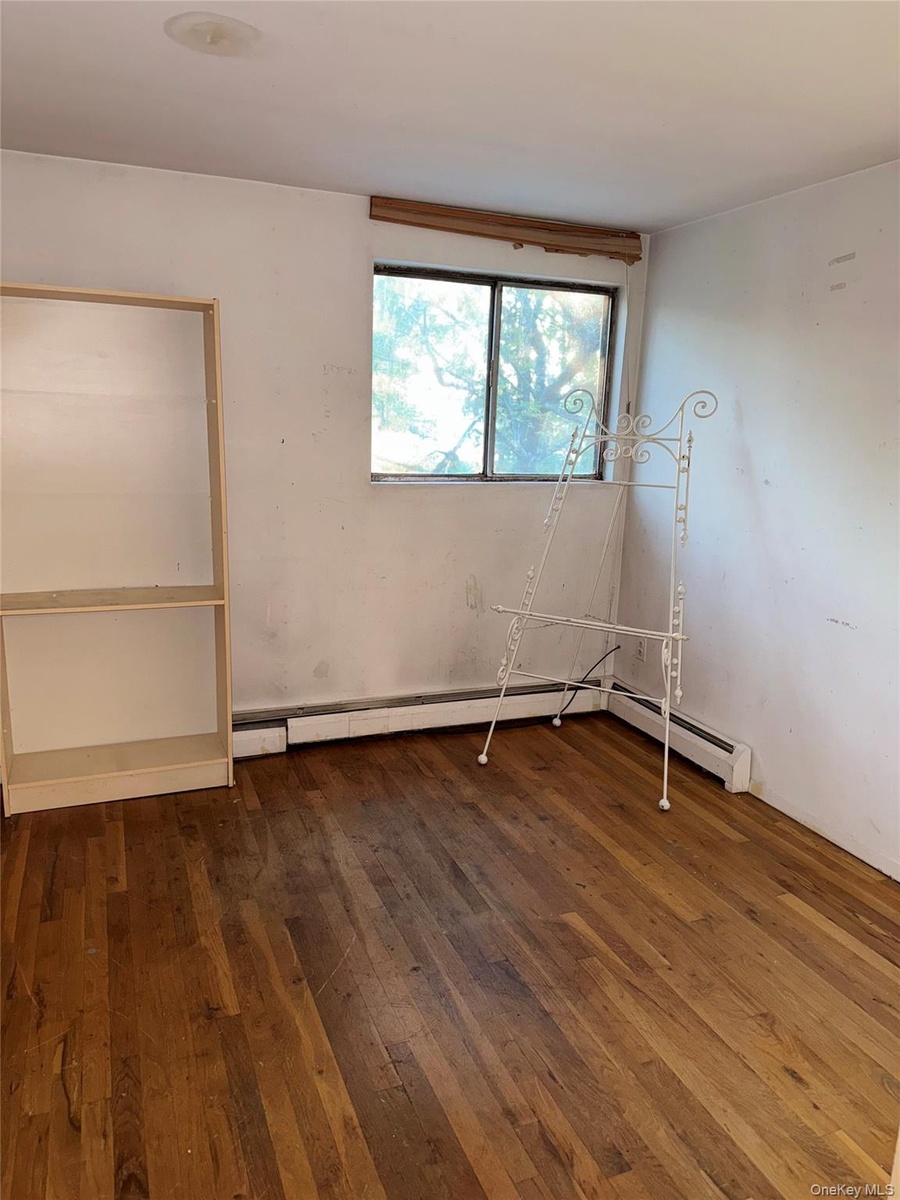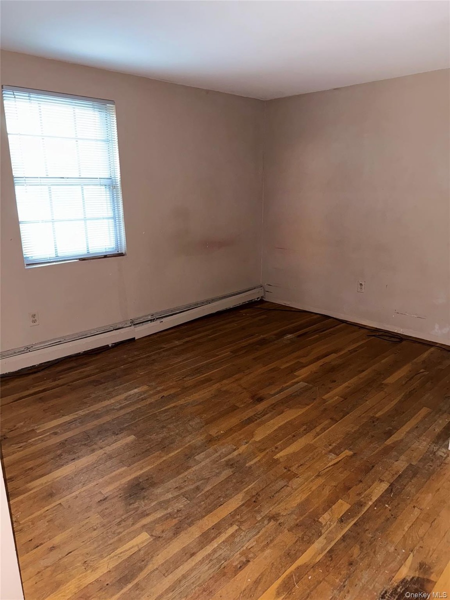 - Spare room featuring dark wood-style floors and a baseboard radiator