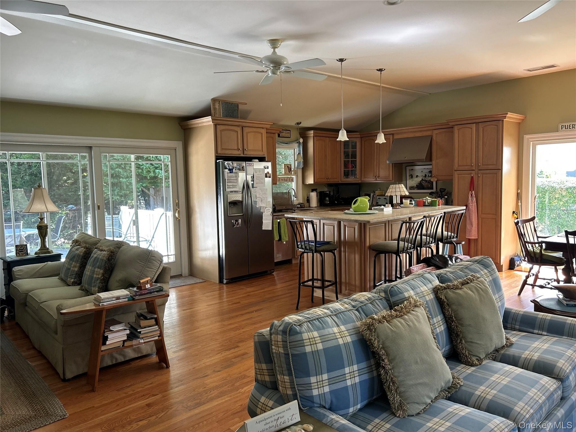 - Living area with wood finished floors, vaulted ceiling, and ceiling fan