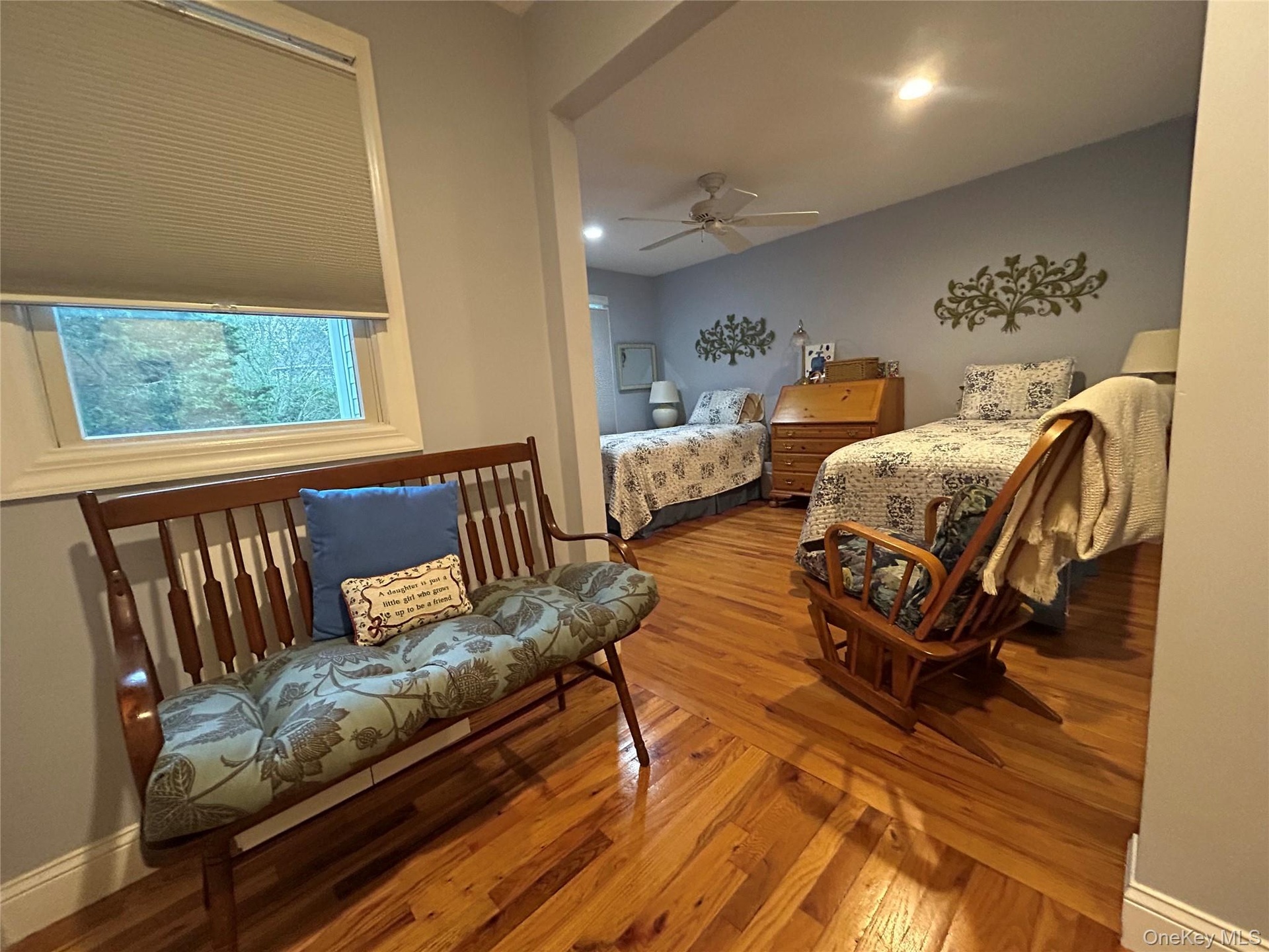 - Bedroom featuring wood finished floors, ceiling fan, and recessed lighting