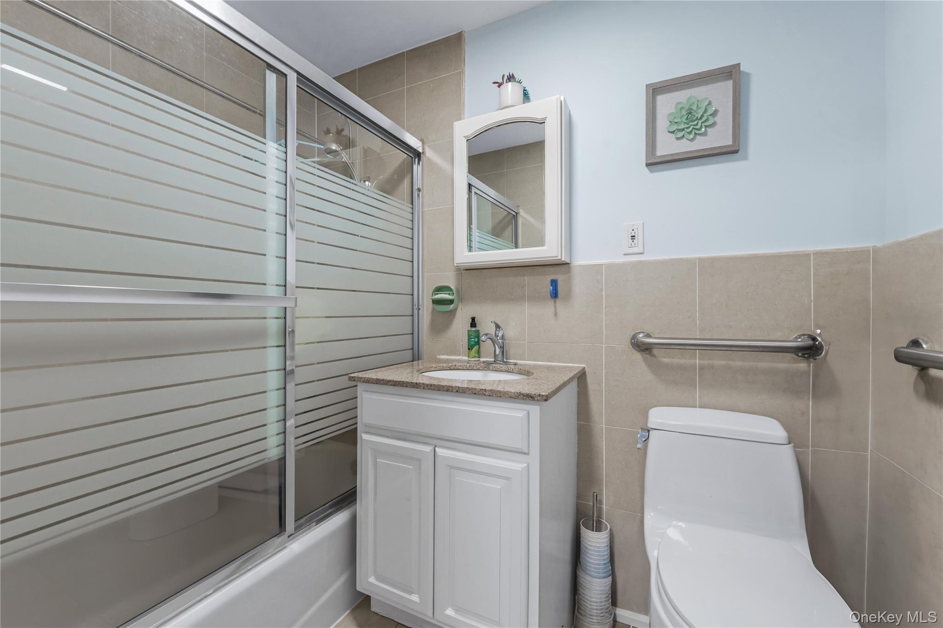 - Full bath featuring bath / shower combo with glass door, vanity, and tile walls