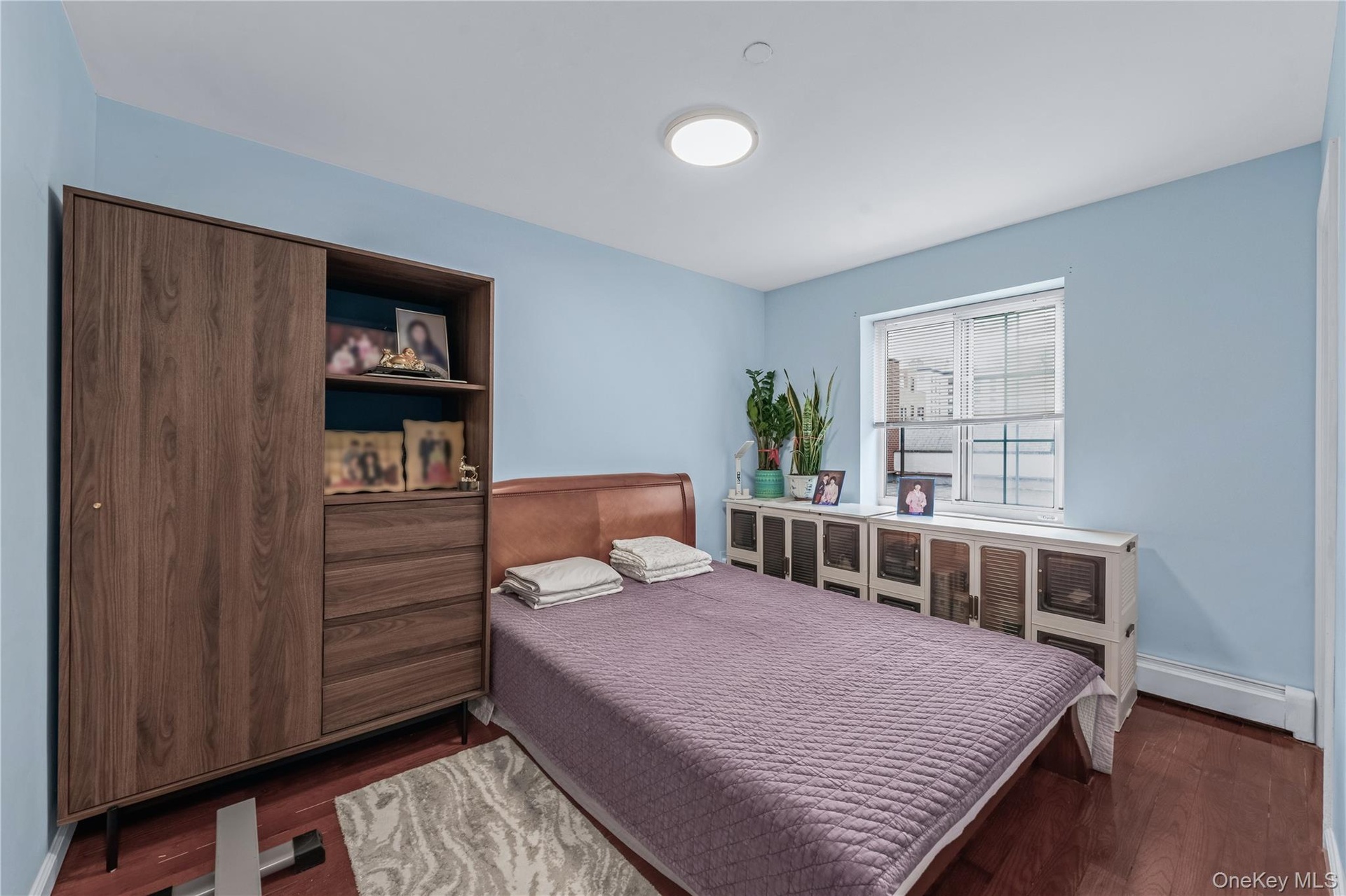 - Bedroom featuring a baseboard radiator and dark wood finished floors