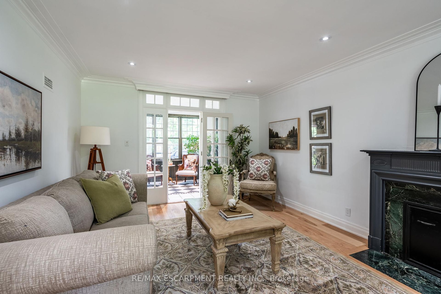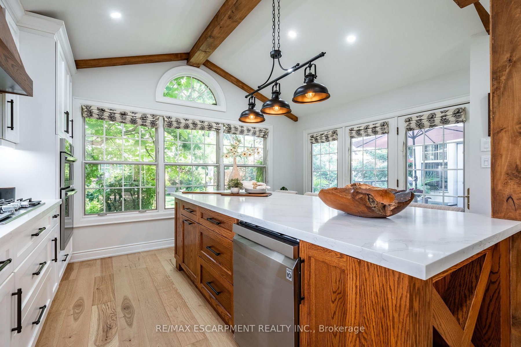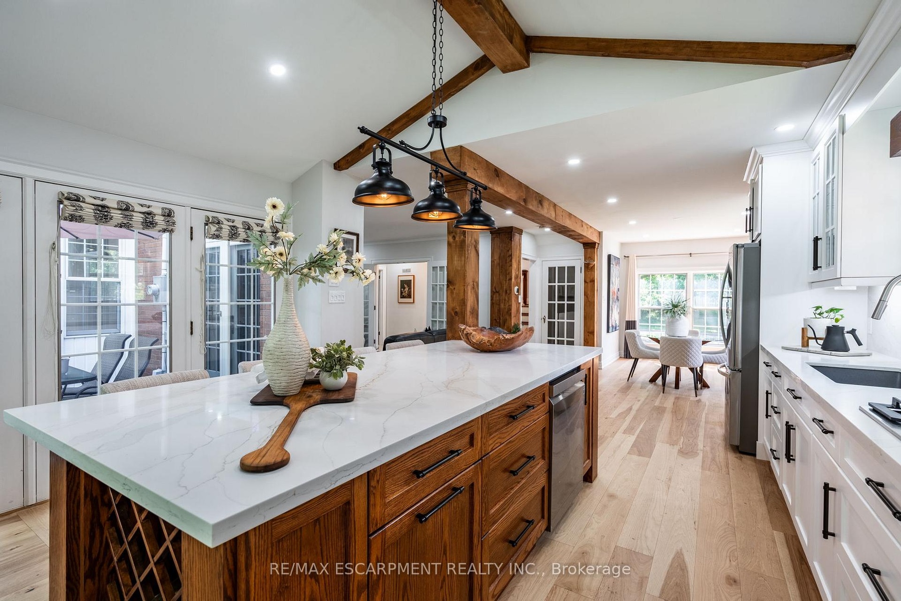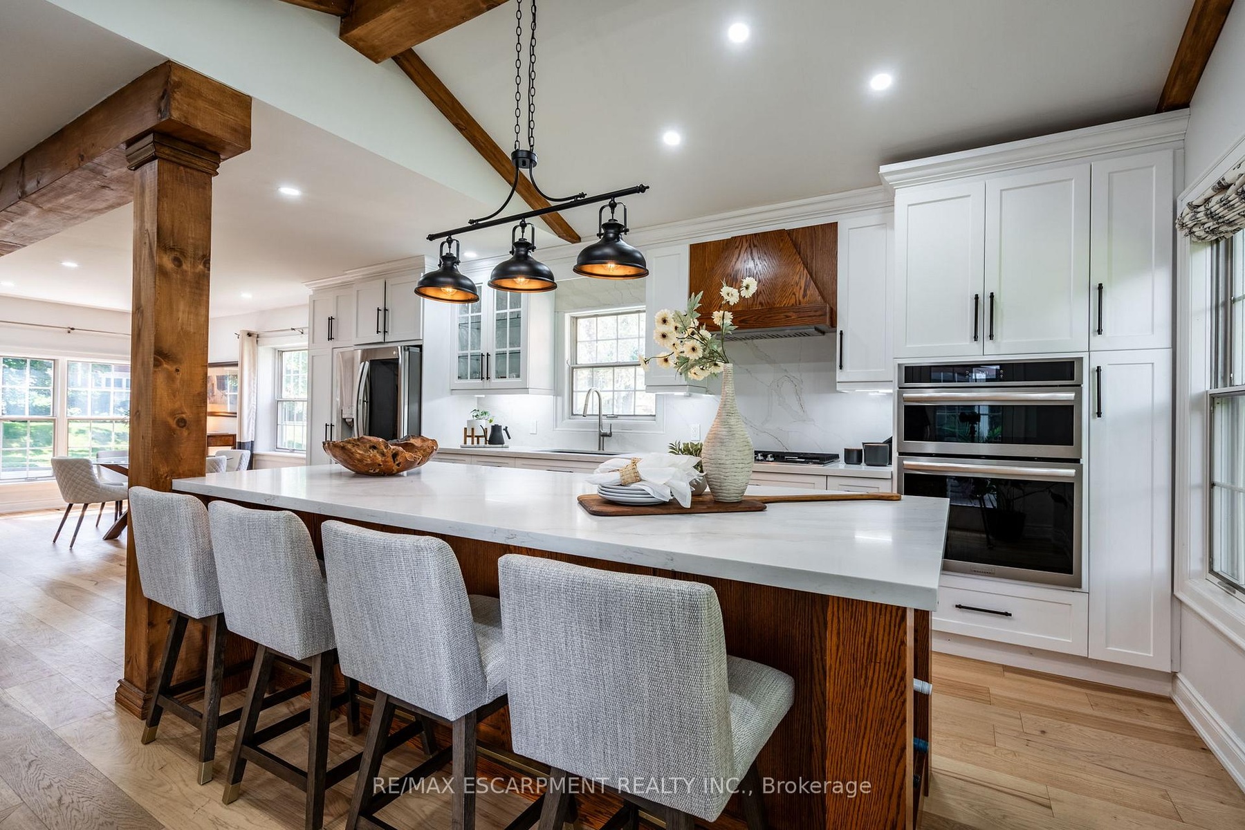 Step into timeless elegance with this beautifully renovated home nestled in the highly sought-after Historical Dickson Hill neighbourhood of West Galt community. Crafted with attention to every detail, this residence blends classic character with modern luxury. The custom-designed kitchen features a spacious center island overlooking a backyard oasis, seamlessly connected to a cozy family room and expansive dining area. Wood beams throughout the main living space pay homage to the homes stately roots. A formal living room with fireplace opens to a charming sunroom with heated floor - perfect for enjoying views of the lush, manicured gardens year-round. Upstairs, you'll find four generously sized bedrooms, including a luxurious primary suite with a spa-inspired 5-piece ensuite and a soothing soaker tub. The finished lower level offers flexible space for recreation or a fifth bedroom, complete with a gas fireplace for ultimate comfort. Located adjacent to the iconic Gas Light District, this home offers unbeatable walkability - just steps to Cambridge Mill, boutique shops, cafés, the Farmers Market, and scenic Riverfront trails.