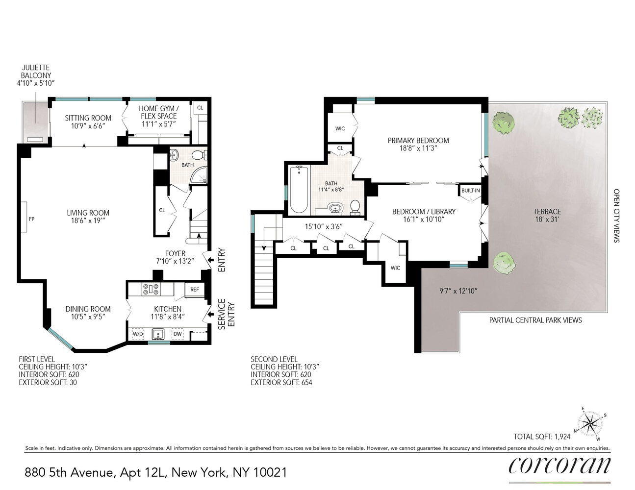 A rare offering, this glamorous duplex is the perfect pied-a-terre or full-time residence for the discerning individual seeking gracious living in a distinguished Emery Roth designed Fifth Avenue cooperative. One of only a handful of duplexes and with ceilings unique to the building of over 10 ft., this residence combines timeless architectural details with the rarity of expansive private outdoor space. The apartment's gracious interiors open onto an approximately 700 square foot south and west-facing terrace with sweeping, open views of the city skyline and partial park views. A large foyer leads to the main level of the duplex. Perfect for both grand entertaining and gracious living, the generously sized living room with decorative fireplace easily accommodates multiple seating areas and art displays. Filled with light from oversized windows and the open southern exposure, the living room flows into a spacious dining area with room for large gatherings. The windowed kitchen off the dining area offers custom cabinetry, generous storage and an in-unit washer/dryer. An additional gym or home office space is also located on this floor, along with a Juliette balcony, and additional full bathroom.