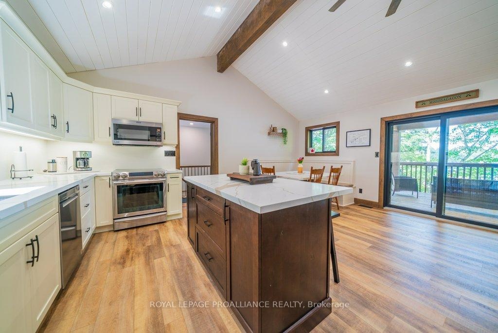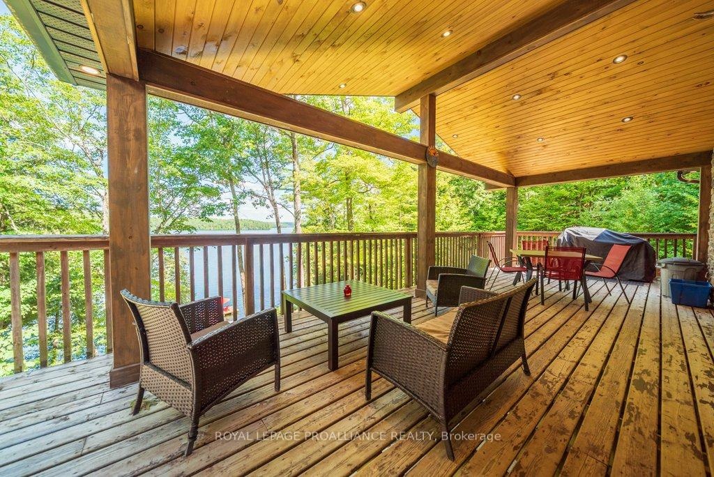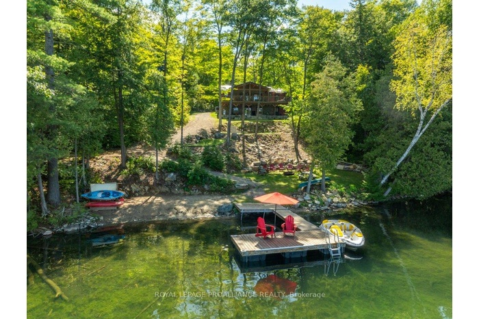 Welcome to Mississagaon , a spring water lake with its unique blue / green waters recognised for its quality features an unspoiled shorelines and a tranquil setting that is true Canadiana. Enjoy quiet paddleboarding or show off your wakeboarding skills. The deep waters offer will intrigue anglers and the swimming is second to none. Tucked into a quiet bay with panoramic views you will take it all in from 1202 Rocky Lane. A naturally landscaped setting opens up to a completely renovated cottage home completed between 2022-2024 with a walkout basement and and expansive covered deck with vaulted ceilings that you won't ever want to leave. Perfect for families, the space is arranged both indoors and out for families to enjoy. Attention to a large family room and kitchen area to the lower walkout out and its rec room are easy gathering spots for friends and family at all ages to gather. Four convenient bedrooms and bathrooms on each level provide privacy and utility. The outdoor space is unique and designed for family fun amongst mature trees and unique rock formations. Get the group together and enjoy the sandy beach volley court, or the grassy area for your favorite outdoor games. Pick up your putter as you head toward the water and challenge your golf skills on this tiered putting green that will surely be a source of stories and fun. At the water a large fire pit is a positioned to take in panoramic views as you look down the lake, At night the stars are spectacular and yours to enjoy in a private setting. Back to the dock where you can dip your toes in and appreciate your accomplishments. An additional lot a short walk from the property is included - a great spot to consider a build for extended families or that workshop you have always wanted. Convenient access to to local amenities, trail systems this is a must see property. Welcome to the Land O' Lakes and this unique property on a spectacular lake.