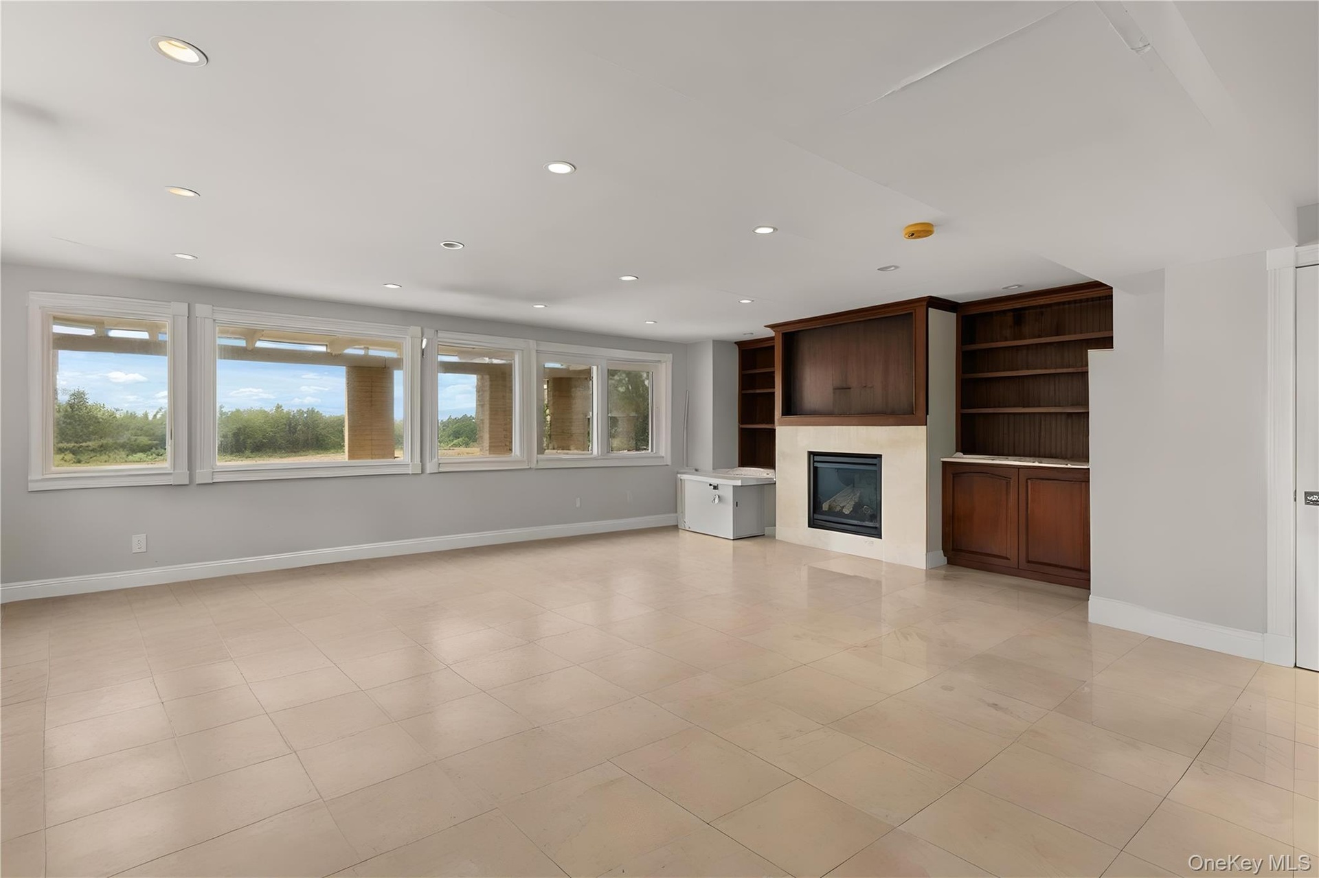 - Lower level Den with a fireplace, recessed lighting, built in shelves, and light patterned Marble floors