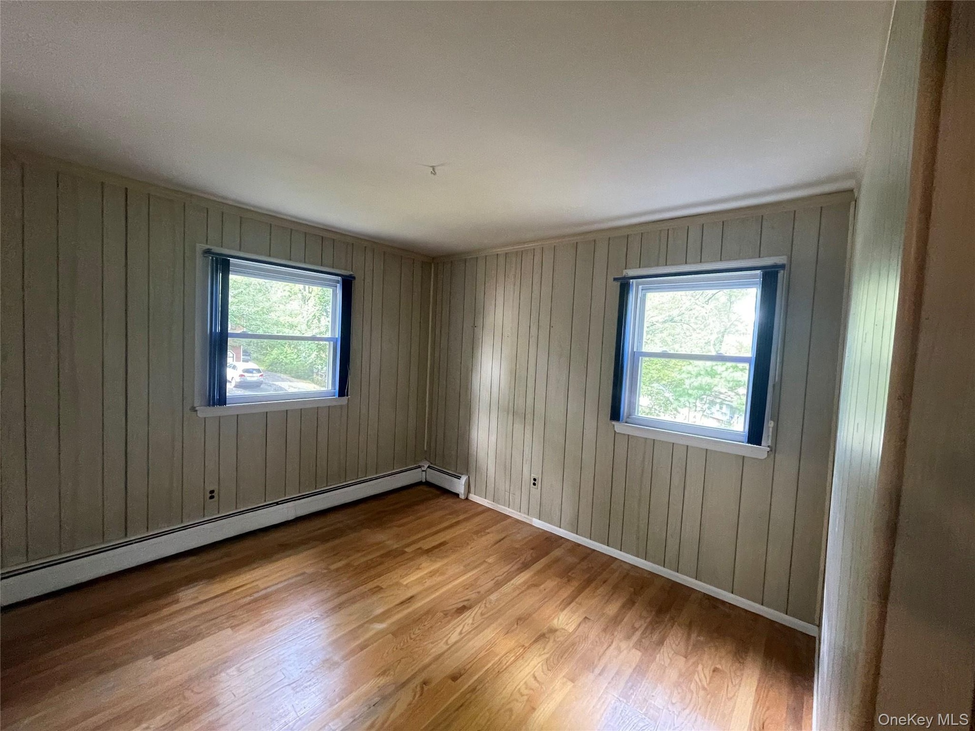 - Spare room with light wood-style floors, a baseboard radiator, plenty of natural light, and wood walls