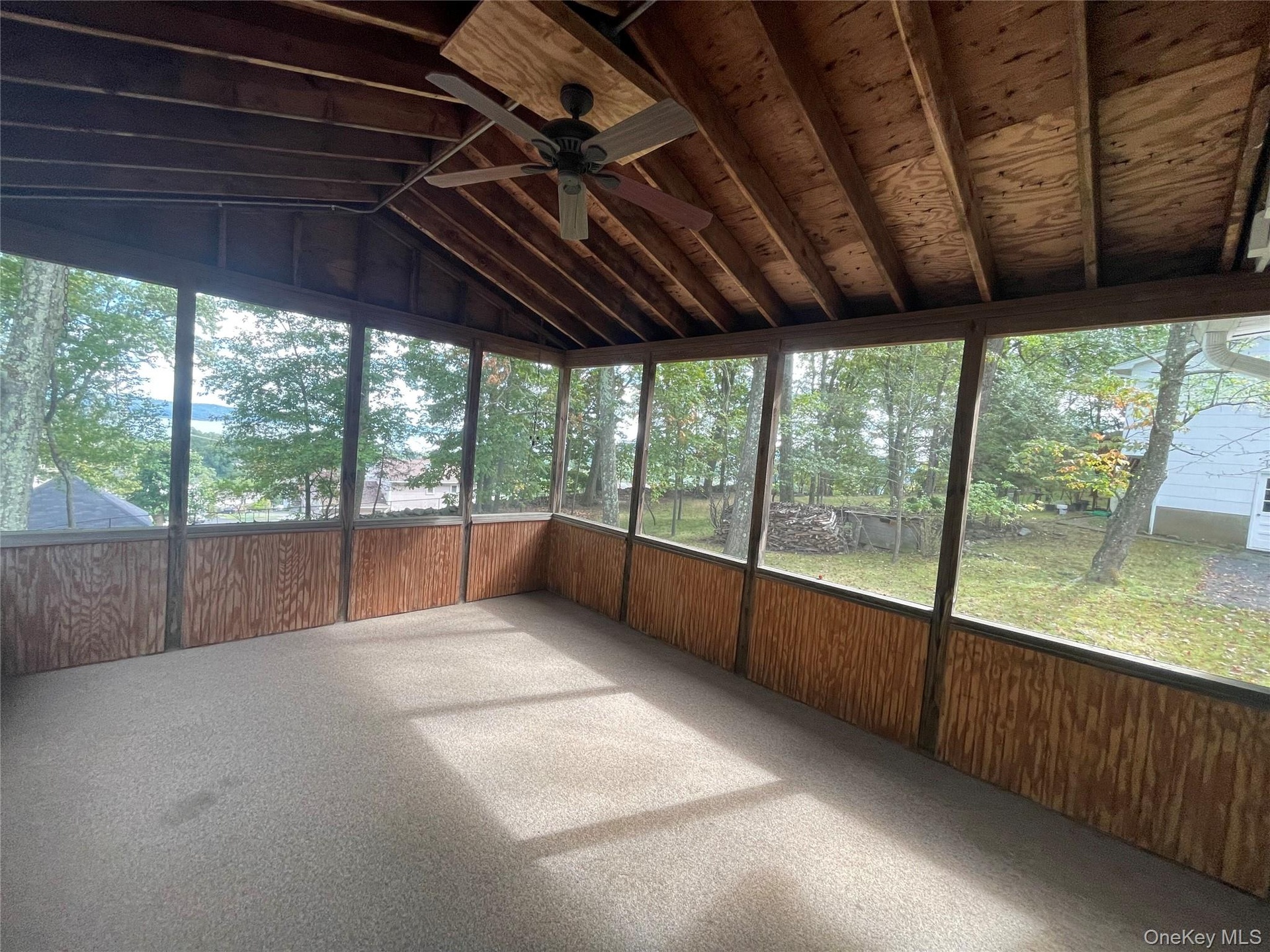 - Unfurnished sunroom featuring vaulted ceiling and ceiling fan