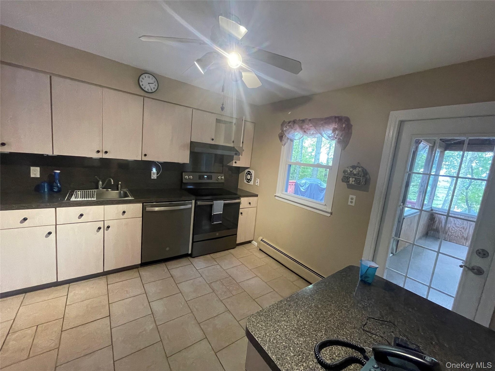 - Kitchen with electric stove, baseboard heating, ceiling fan, light tile patterned flooring, and under cabinet range hood