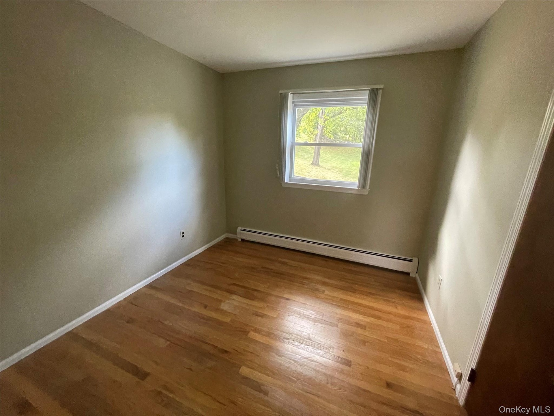 - Empty room with baseboard heating and wood finished floors