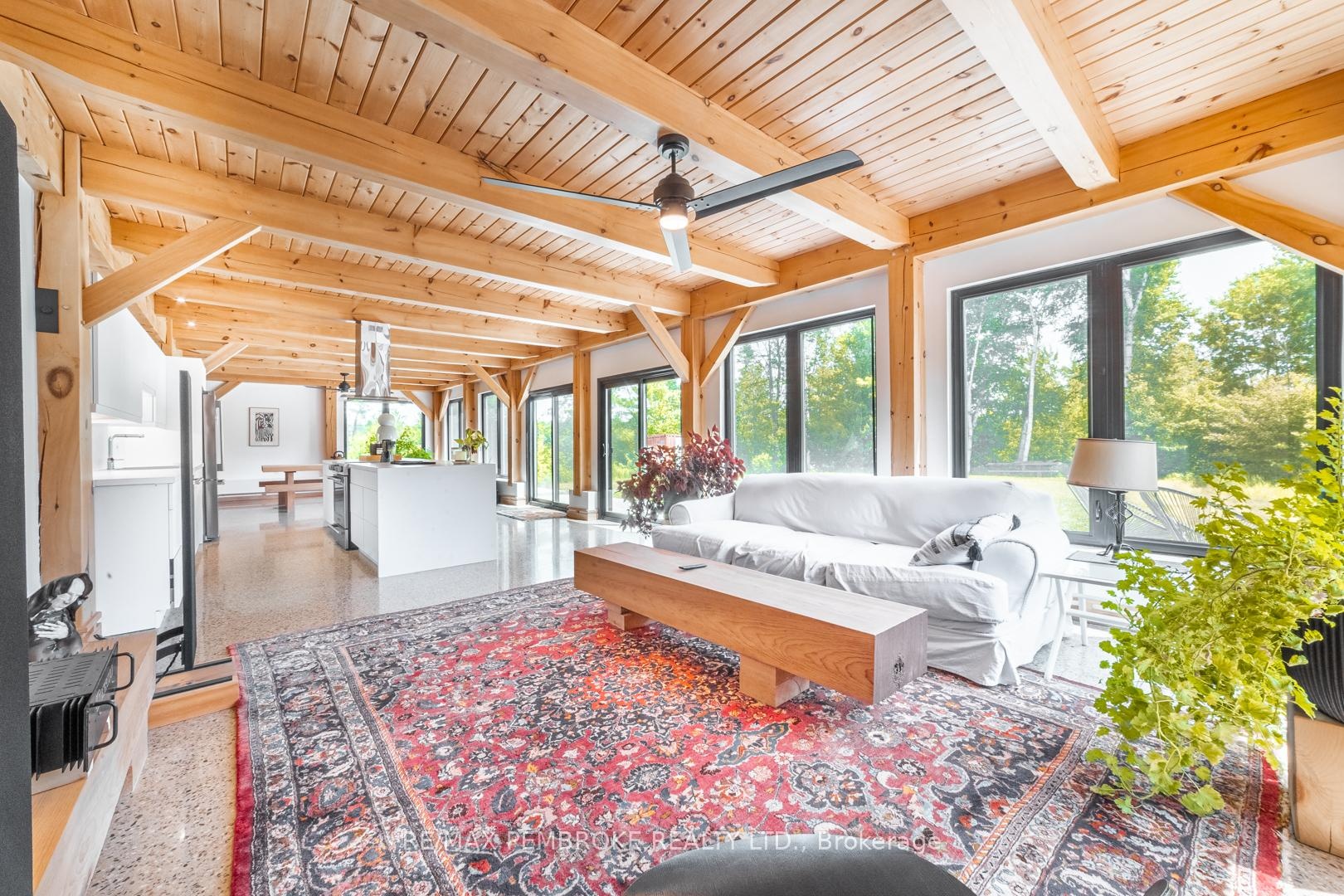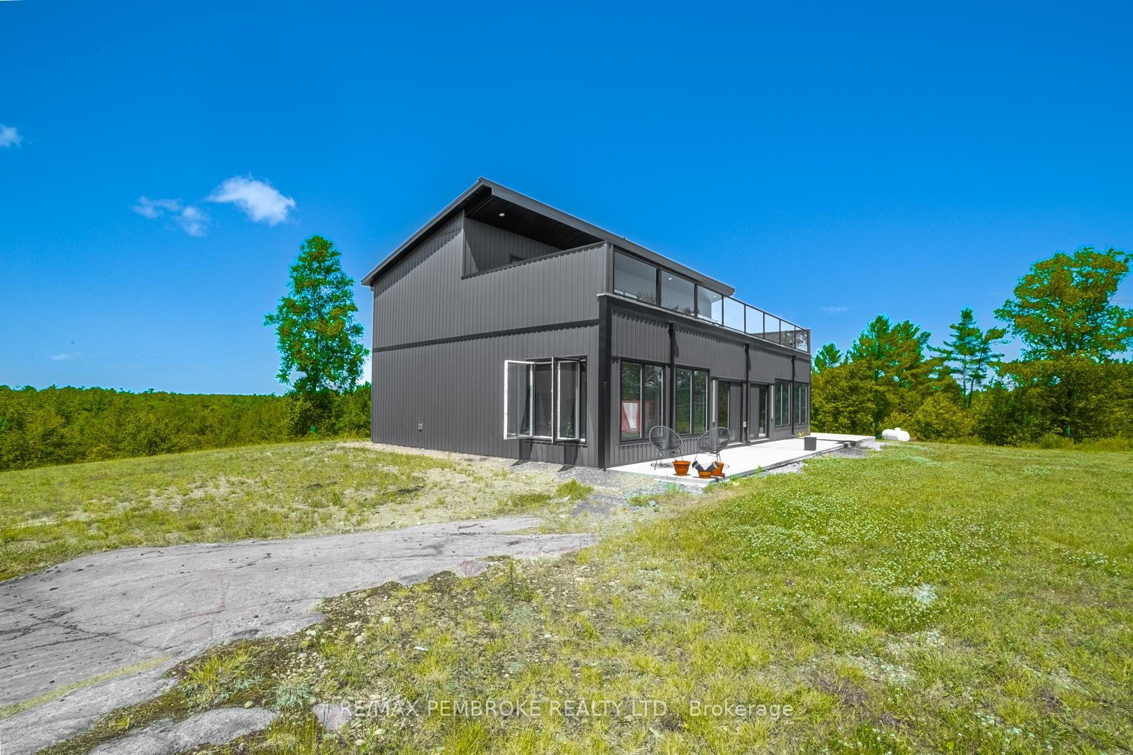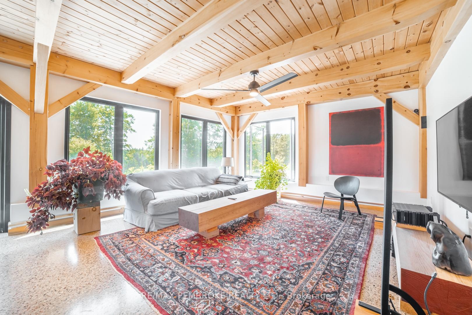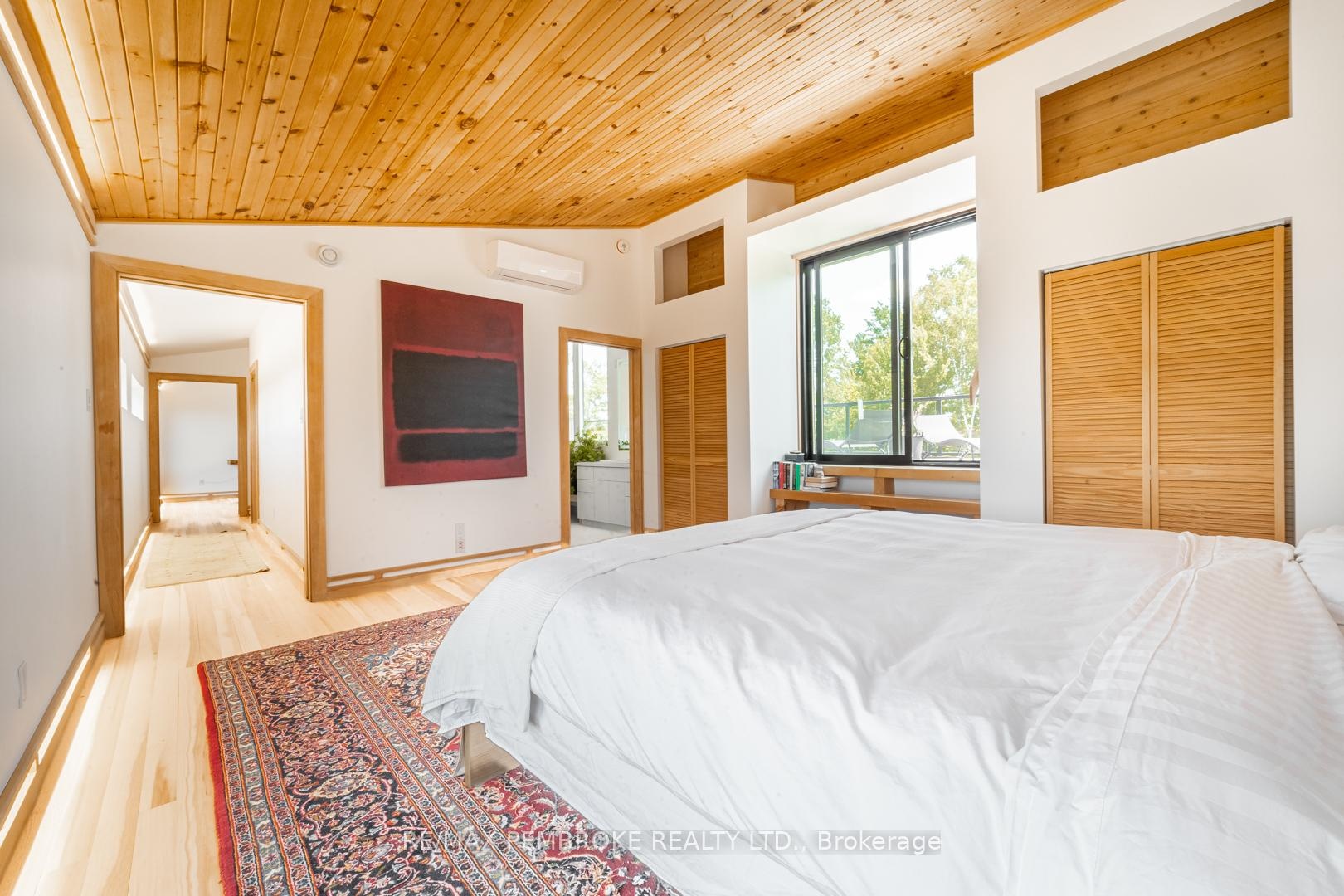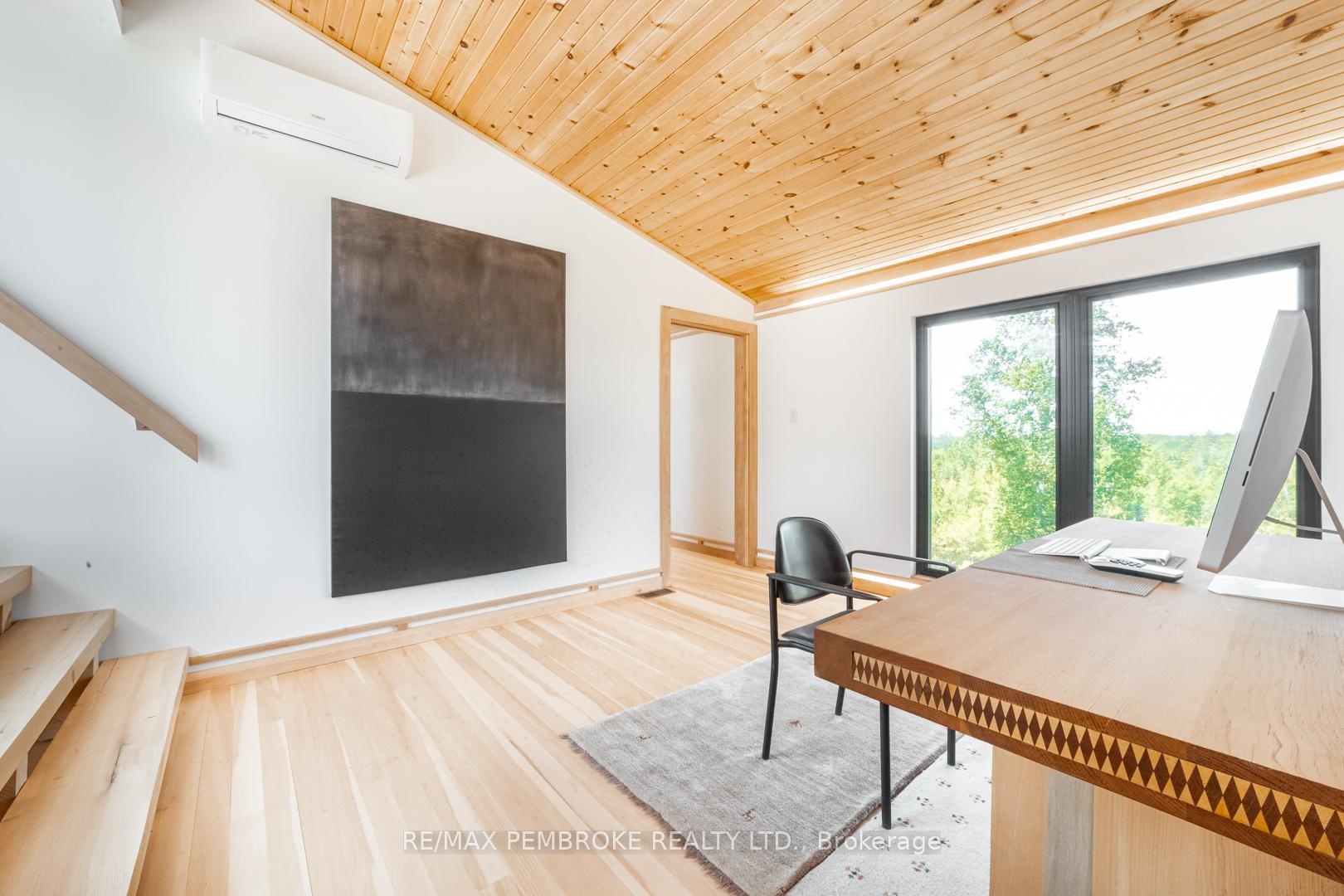 This Scandinavian style chalet is perched atop the rugged Canadian Shield offering sweeping views of the tree tops and glimpses of the Petawawa River. Walk in the door and be awed by the natural light flooding in, seamlessly blending the outside with the inside. Masterful craftsmanship of the post and beam construction. Polished concrete floors, in-floor heating, amazing pine staircase, and floor to ceiling windows in all give the feeling of being in a spa! The kitchen offers a 12' island with seamless white cabinetry, soft closures and stainless appliances. There are 2 primary suites offering attached spa like baths (1 on the main floor and 1 on the 2nd floor). Mud room area with loads of closet space and a main floor laundry. Make your way to the 2nd floor where you will find 2 good sized bedrooms with unique access to the large deck. The 2nd floor deck is a private and relaxing area great for yoga or entertaining with its own outdoor shower! The deck has a glass balustrade and waterproof Goodyear membrane. The bedrooms each have energy-efficient heat pumps with AC. This style and location of home is perfect for the outdoor enthusiast!
