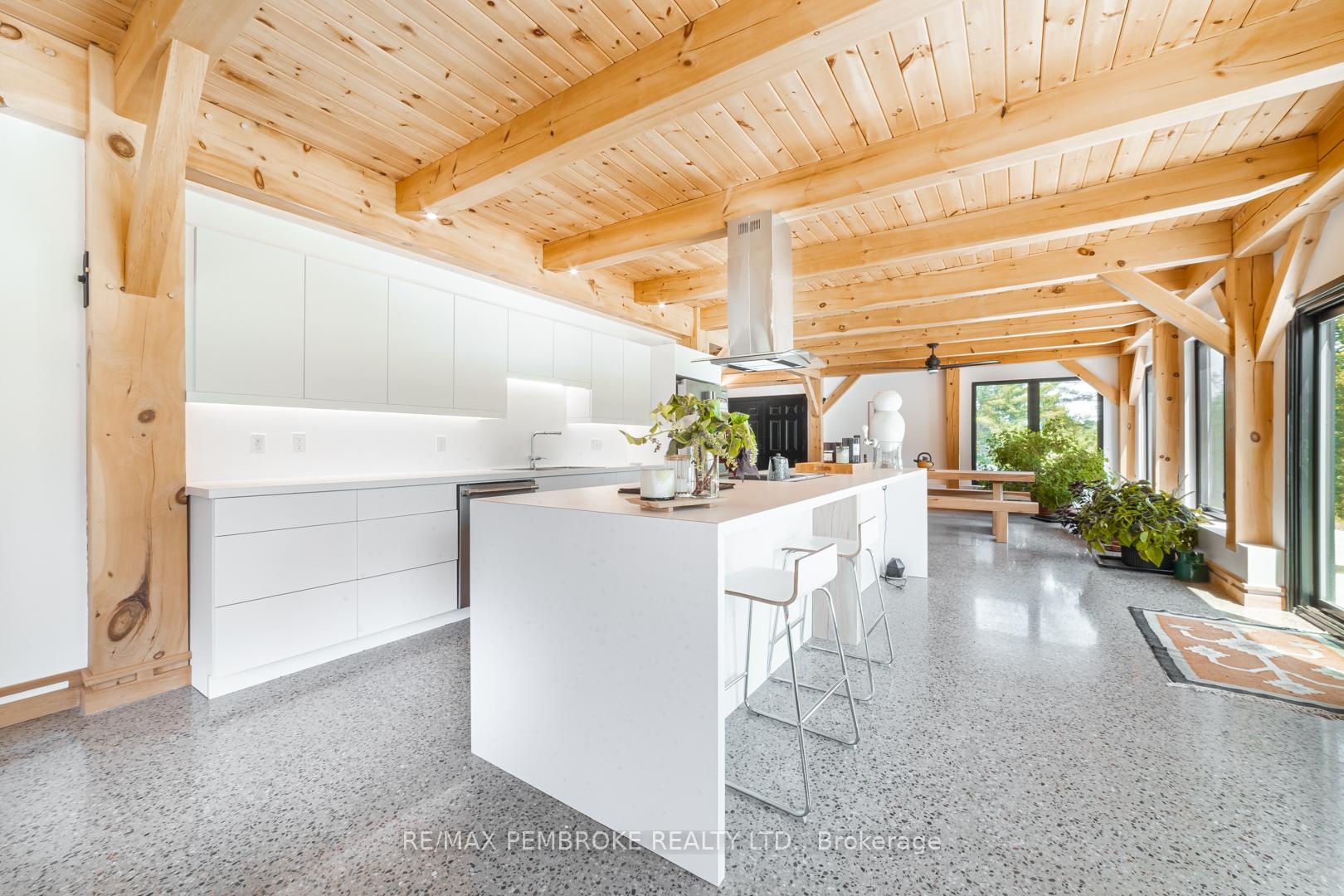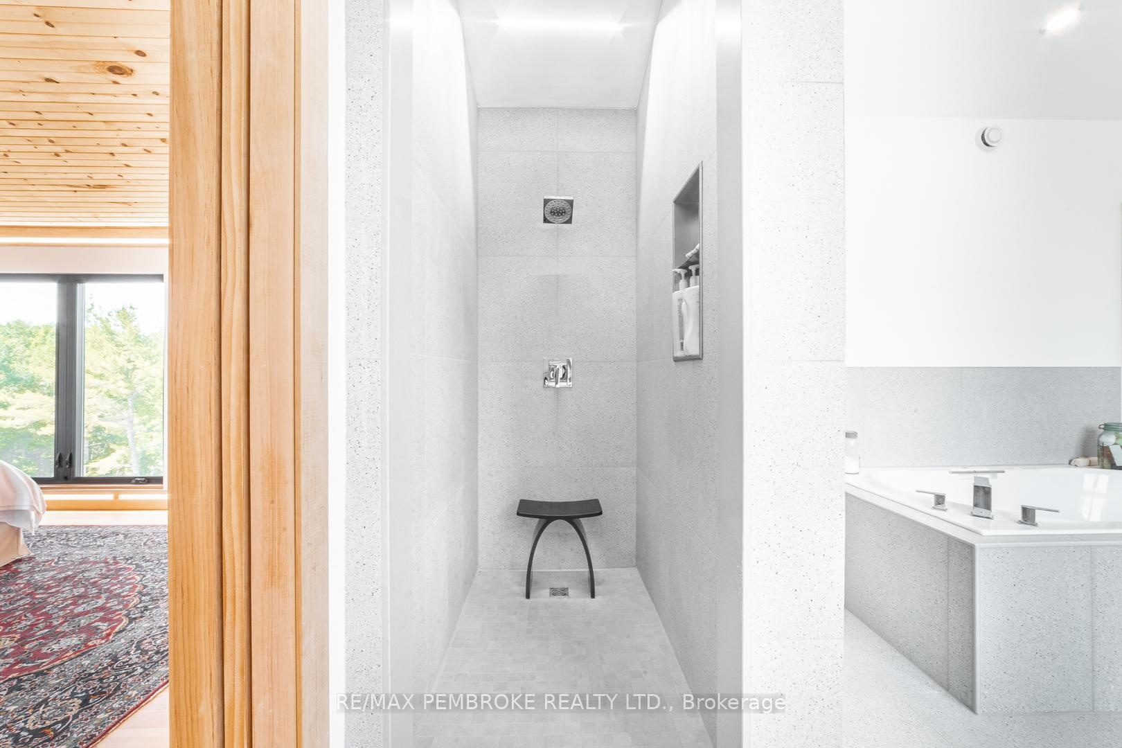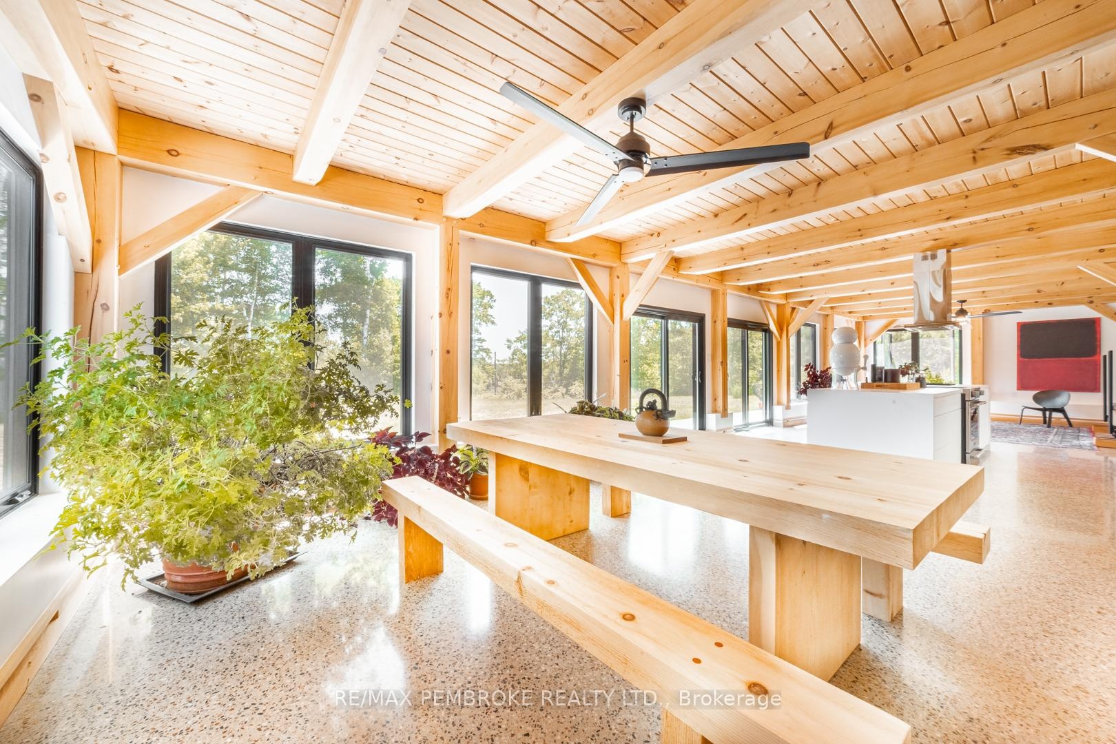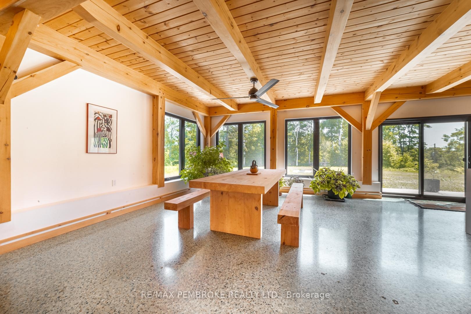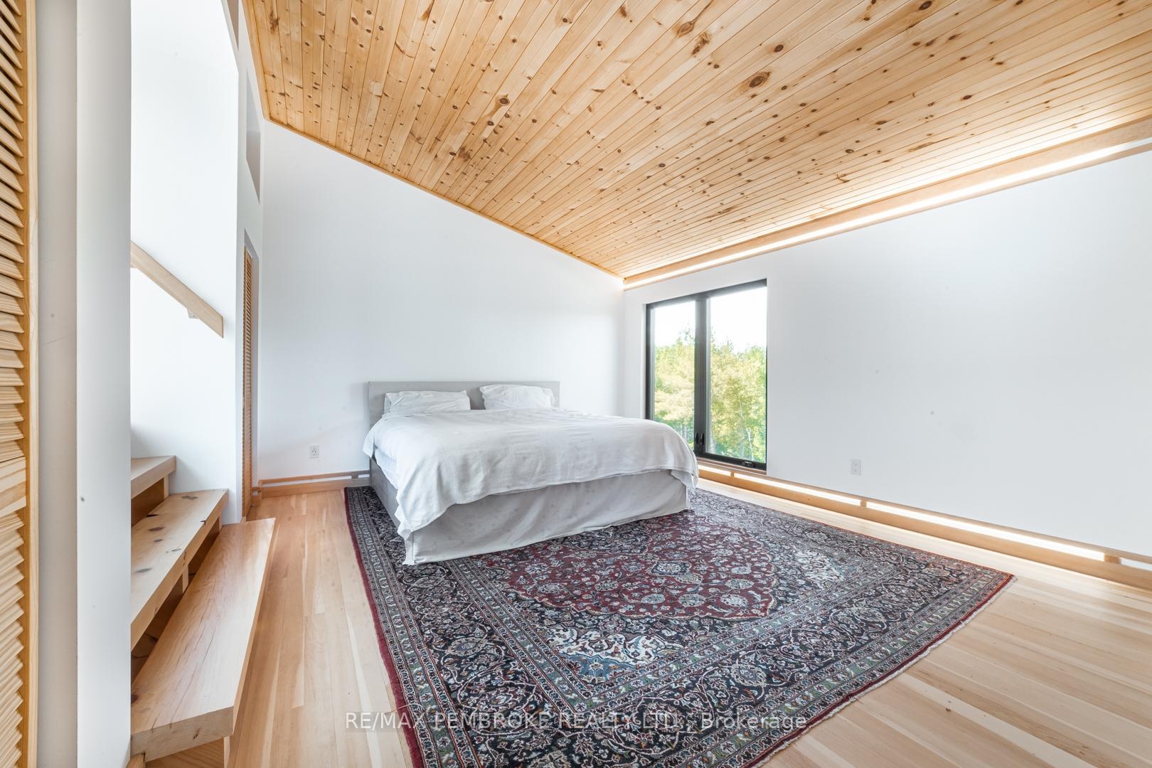 This Scandinavian style chalet is perched atop the rugged Canadian Shield offering sweeping views of the tree tops and glimpses of the Petawawa River. Walk in the door and be awed by the natural light flooding in, seamlessly blending the outside with the inside. Masterful craftsmanship of the post and beam construction. Polished concrete floors, in-floor heating, amazing pine staircase, and floor to ceiling windows in all give the feeling of being in a spa! The kitchen offers a 12' island with seamless white cabinetry, soft closures and stainless appliances. There are 2 primary suites offering attached spa like baths (1 on the main floor and 1 on the 2nd floor). Mud room area with loads of closet space and a main floor laundry. Make your way to the 2nd floor where you will find 2 good sized bedrooms with unique access to the large deck. The 2nd floor deck is a private and relaxing area great for yoga or entertaining with its own outdoor shower! The deck has a glass balustrade and waterproof Goodyear membrane. The bedrooms each have energy-efficient heat pumps with AC. This style and location of home is perfect for the outdoor enthusiast!