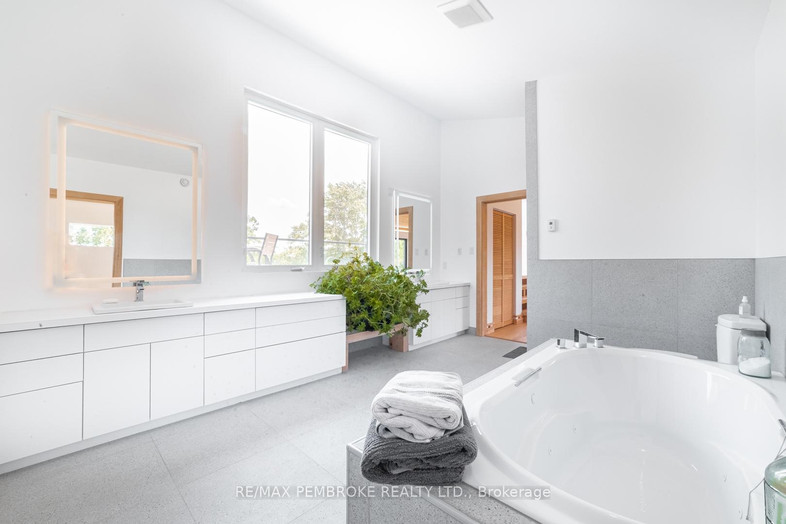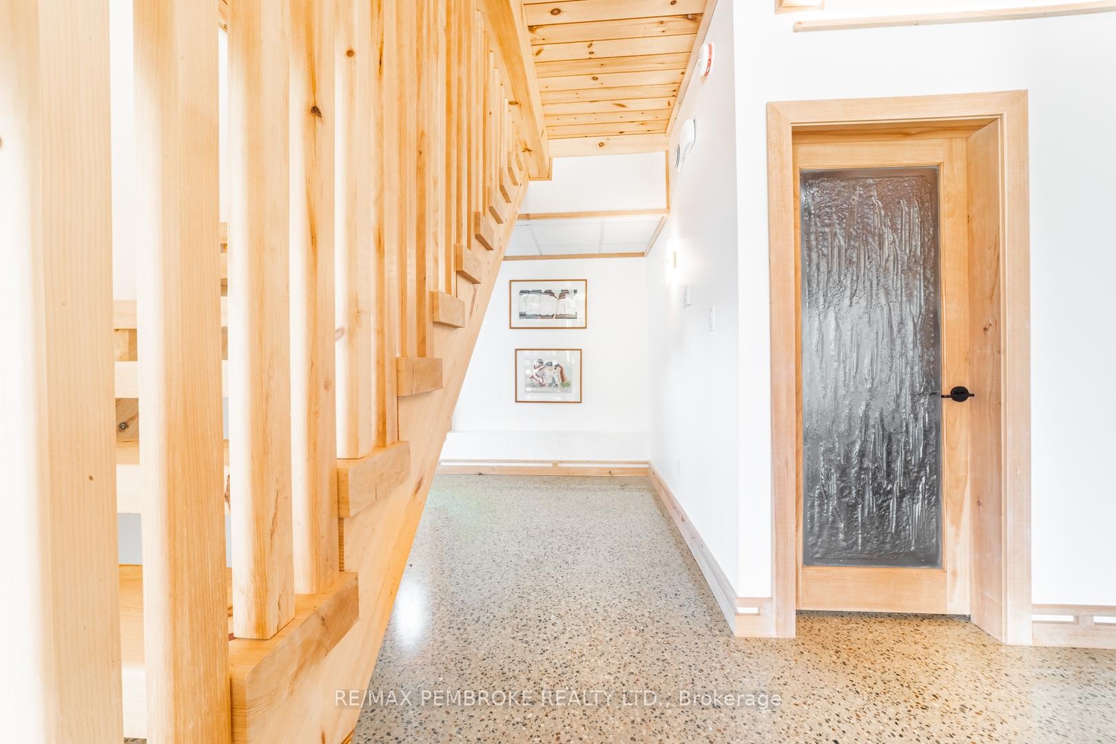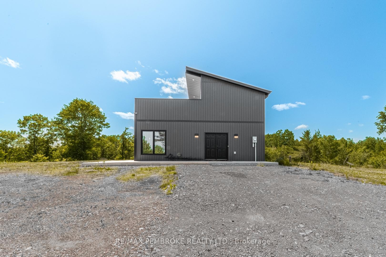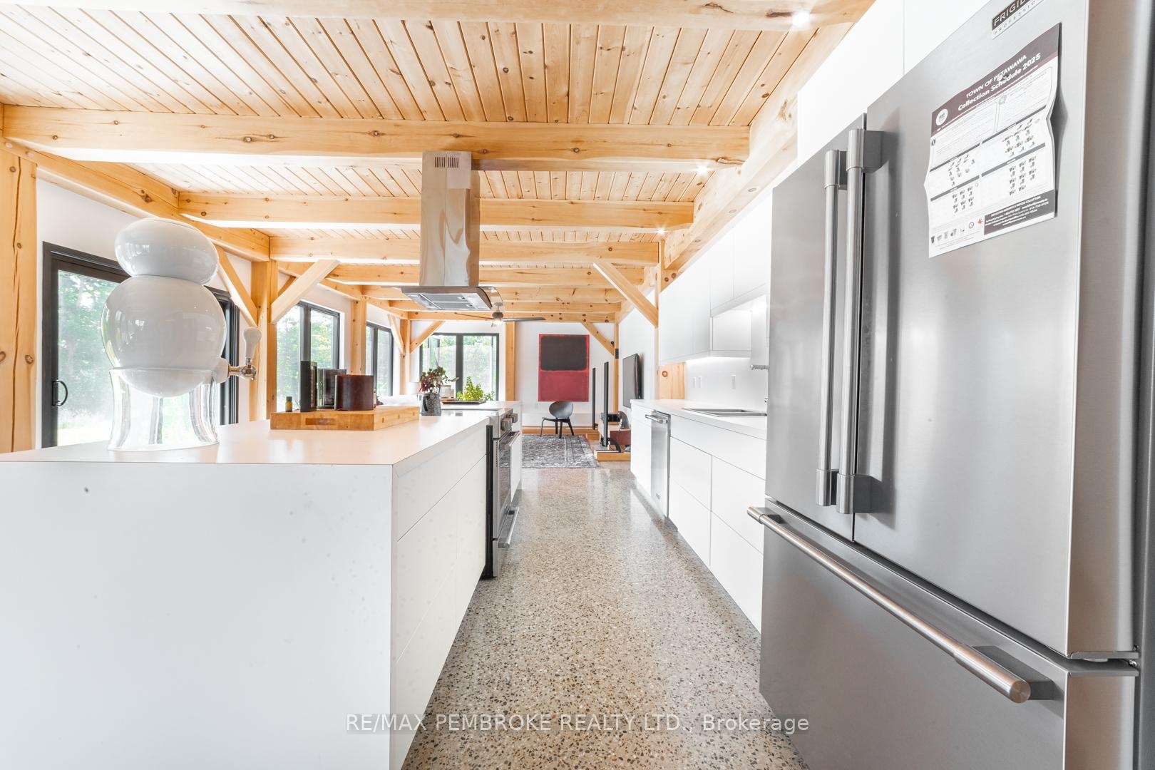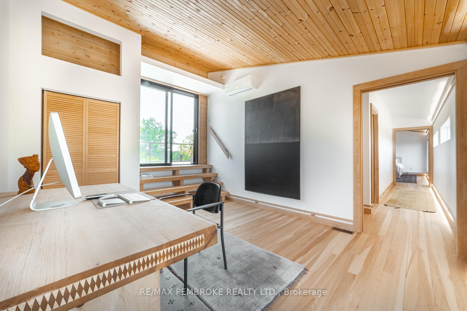 This Scandinavian style chalet is perched atop the rugged Canadian Shield offering sweeping views of the tree tops and glimpses of the Petawawa River. Walk in the door and be awed by the natural light flooding in, seamlessly blending the outside with the inside. Masterful craftsmanship of the post and beam construction. Polished concrete floors, in-floor heating, amazing pine staircase, and floor to ceiling windows in all give the feeling of being in a spa! The kitchen offers a 12' island with seamless white cabinetry, soft closures and stainless appliances. There are 2 primary suites offering attached spa like baths (1 on the main floor and 1 on the 2nd floor). Mud room area with loads of closet space and a main floor laundry. Make your way to the 2nd floor where you will find 2 good sized bedrooms with unique access to the large deck. The 2nd floor deck is a private and relaxing area great for yoga or entertaining with its own outdoor shower! The deck has a glass balustrade and waterproof Goodyear membrane. The bedrooms each have energy-efficient heat pumps with AC. This style and location of home is perfect for the outdoor enthusiast!