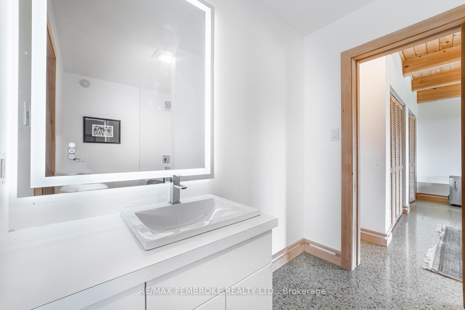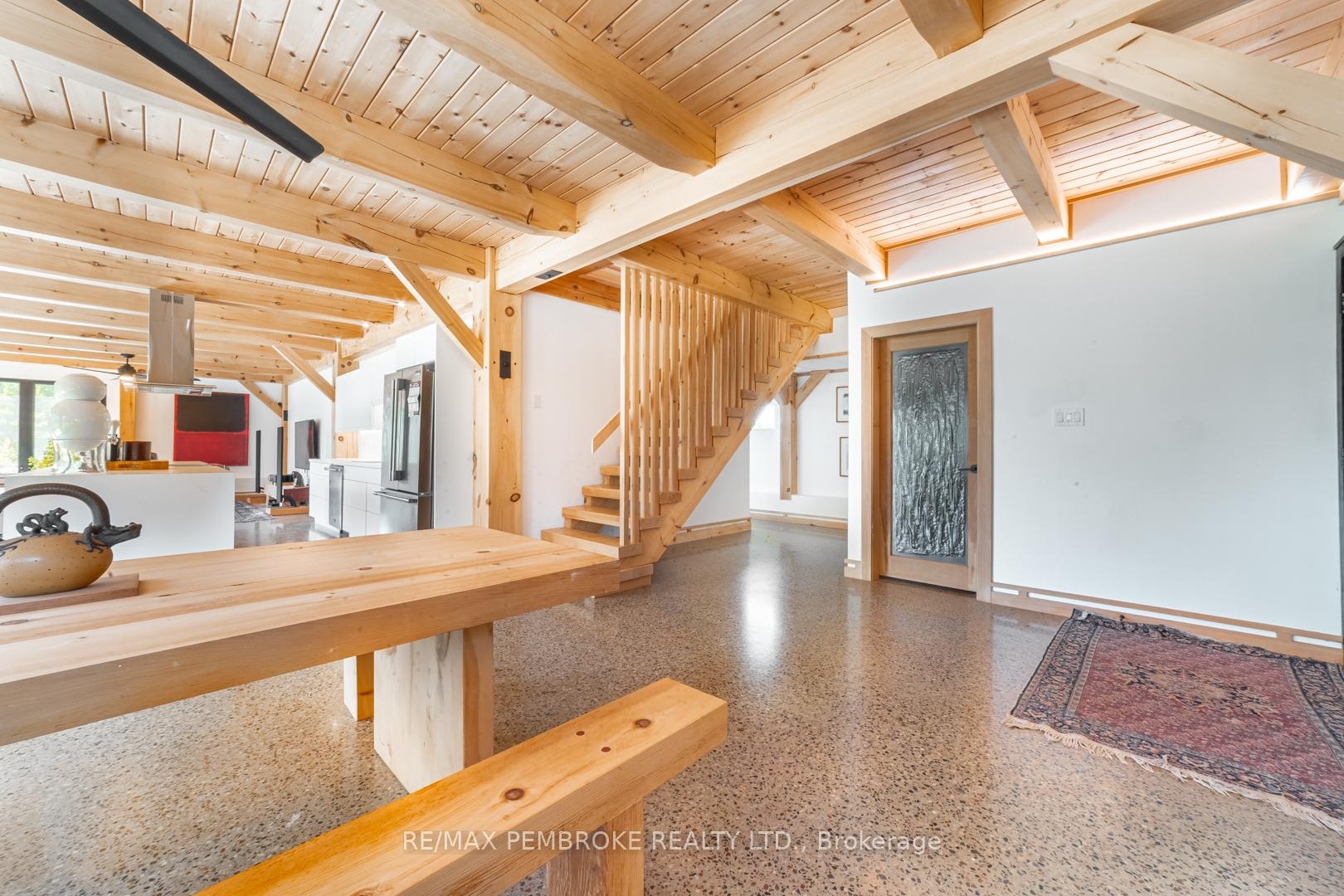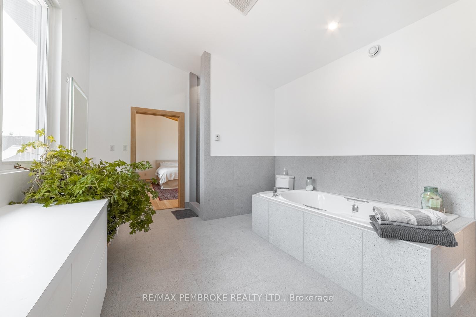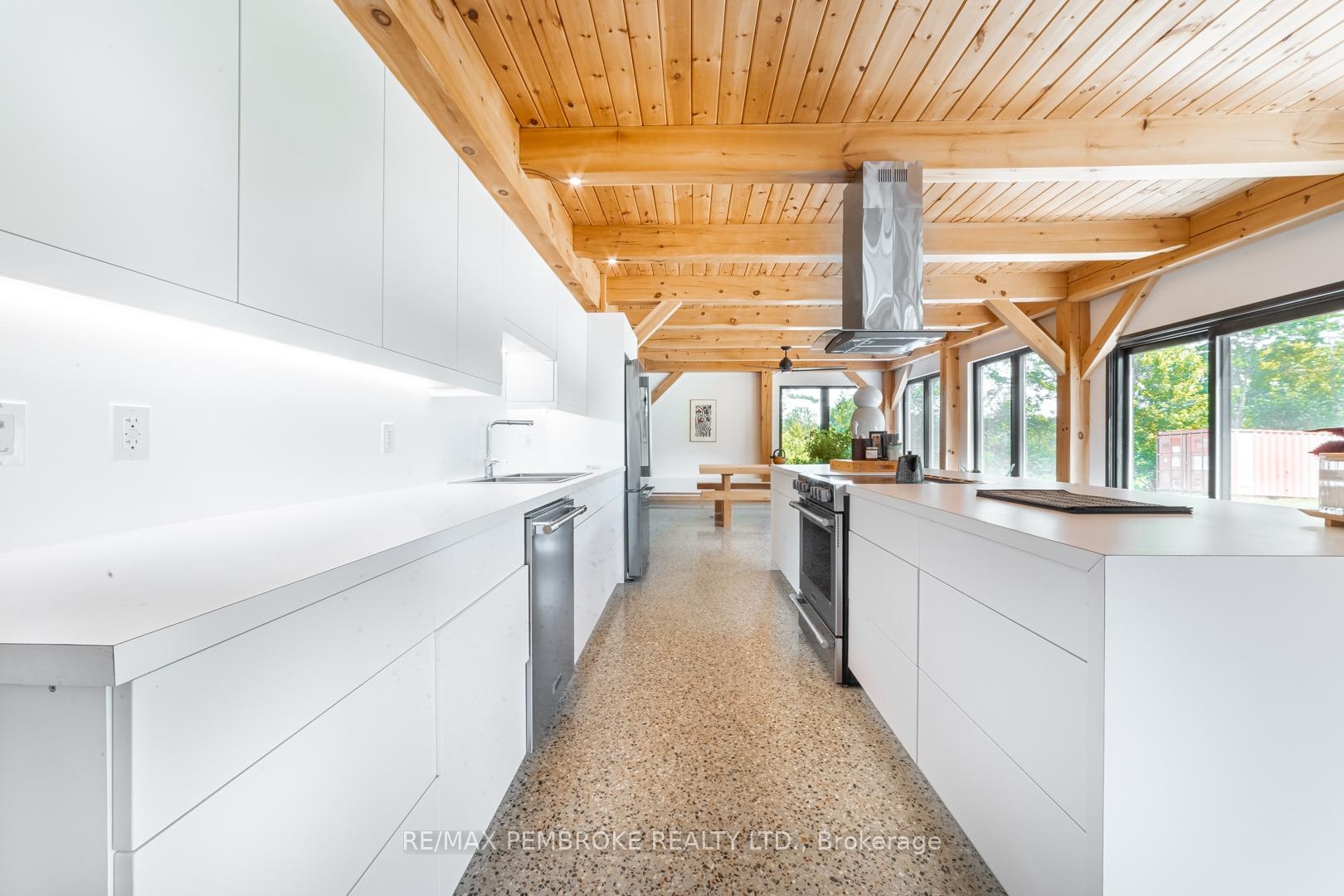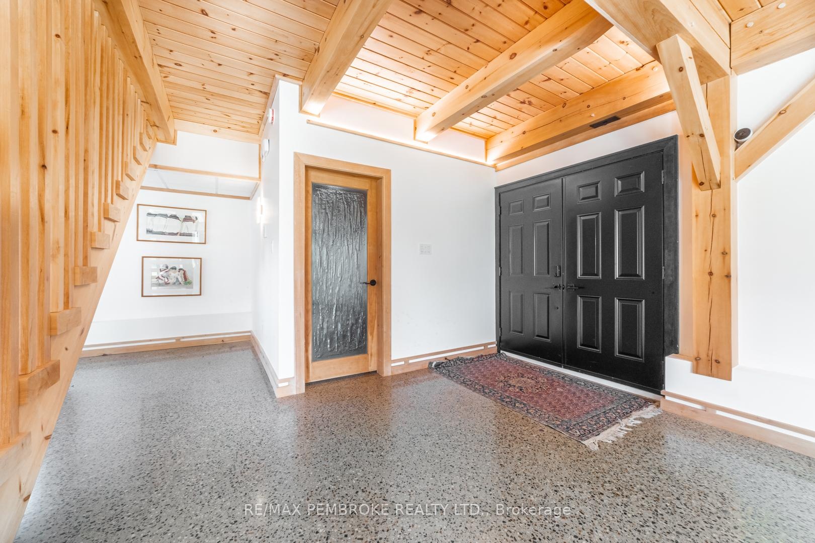 This Scandinavian style chalet is perched atop the rugged Canadian Shield offering sweeping views of the tree tops and glimpses of the Petawawa River. Walk in the door and be awed by the natural light flooding in, seamlessly blending the outside with the inside. Masterful craftsmanship of the post and beam construction. Polished concrete floors, in-floor heating, amazing pine staircase, and floor to ceiling windows in all give the feeling of being in a spa! The kitchen offers a 12' island with seamless white cabinetry, soft closures and stainless appliances. There are 2 primary suites offering attached spa like baths (1 on the main floor and 1 on the 2nd floor). Mud room area with loads of closet space and a main floor laundry. Make your way to the 2nd floor where you will find 2 good sized bedrooms with unique access to the large deck. The 2nd floor deck is a private and relaxing area great for yoga or entertaining with its own outdoor shower! The deck has a glass balustrade and waterproof Goodyear membrane. The bedrooms each have energy-efficient heat pumps with AC. This style and location of home is perfect for the outdoor enthusiast!