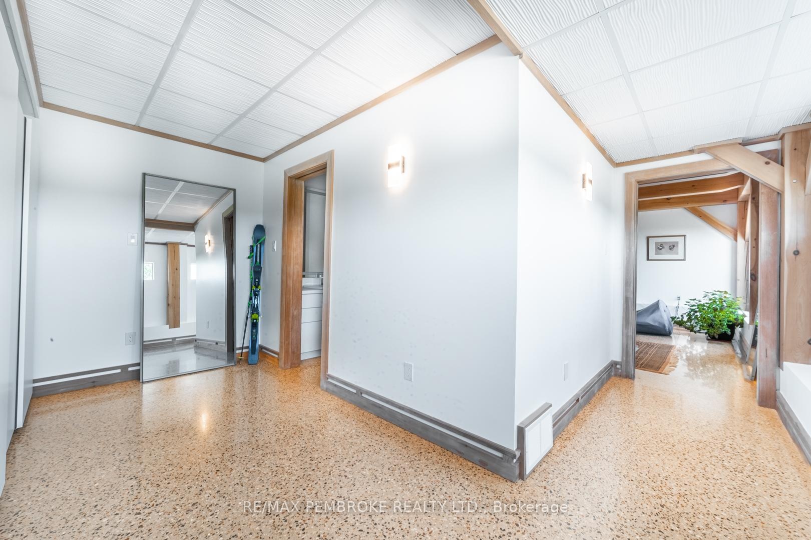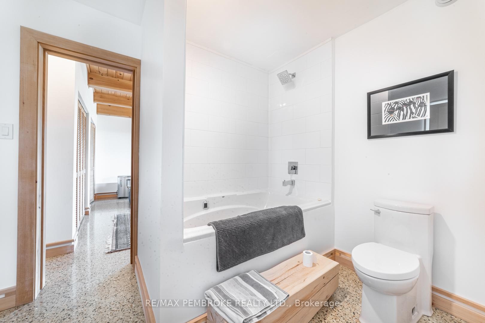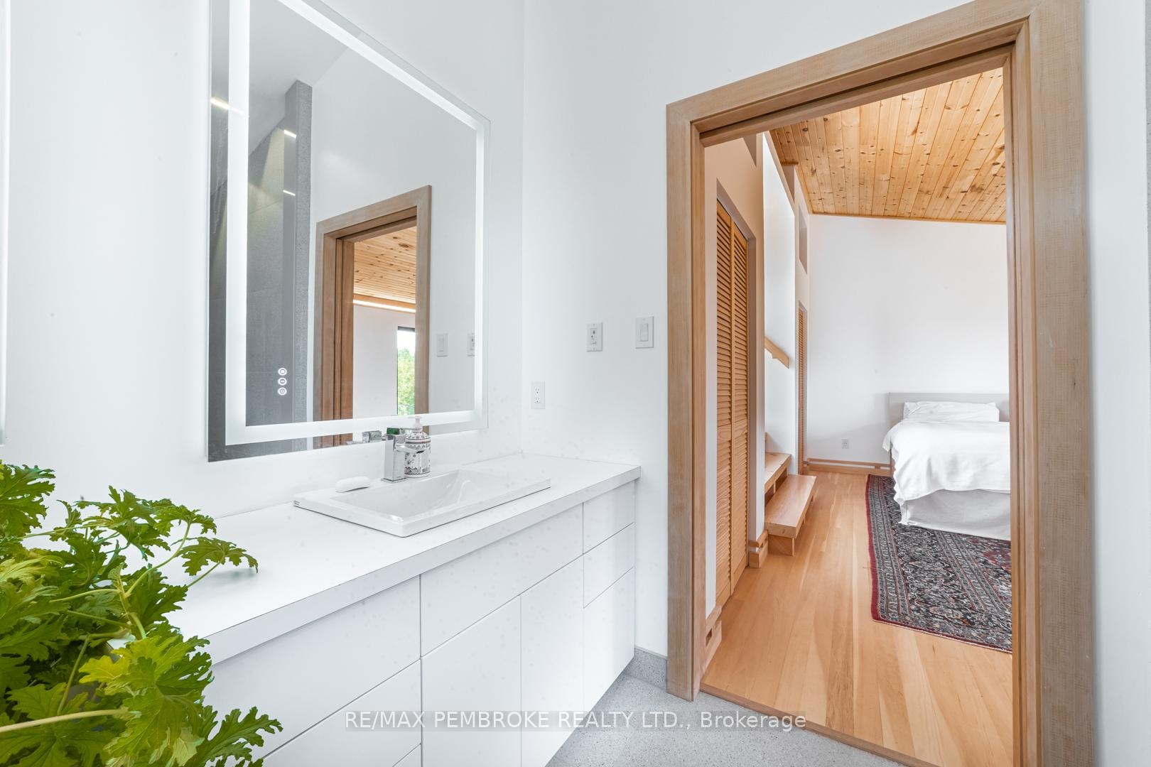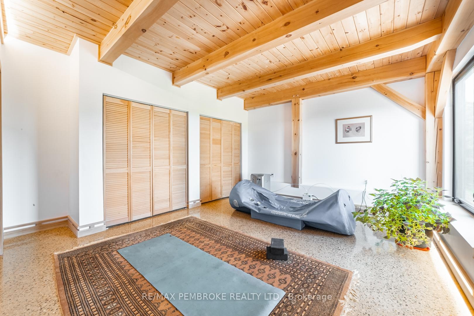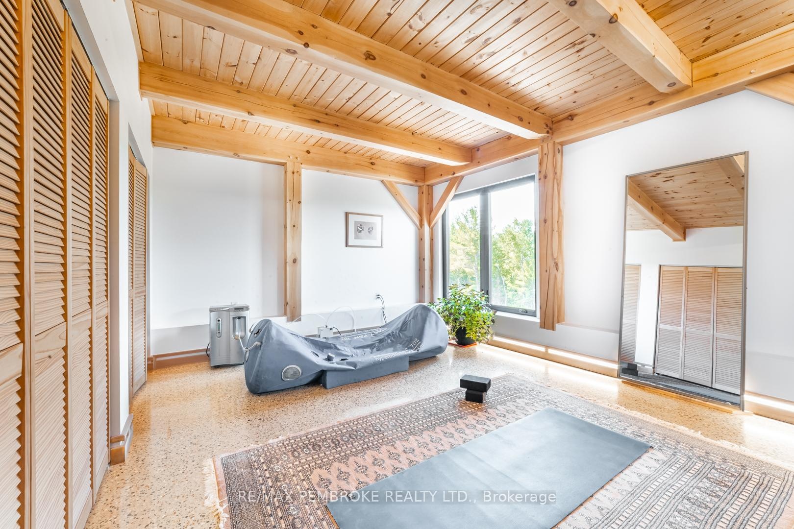 This Scandinavian style chalet is perched atop the rugged Canadian Shield offering sweeping views of the tree tops and glimpses of the Petawawa River. Walk in the door and be awed by the natural light flooding in, seamlessly blending the outside with the inside. Masterful craftsmanship of the post and beam construction. Polished concrete floors, in-floor heating, amazing pine staircase, and floor to ceiling windows in all give the feeling of being in a spa! The kitchen offers a 12' island with seamless white cabinetry, soft closures and stainless appliances. There are 2 primary suites offering attached spa like baths (1 on the main floor and 1 on the 2nd floor). Mud room area with loads of closet space and a main floor laundry. Make your way to the 2nd floor where you will find 2 good sized bedrooms with unique access to the large deck. The 2nd floor deck is a private and relaxing area great for yoga or entertaining with its own outdoor shower! The deck has a glass balustrade and waterproof Goodyear membrane. The bedrooms each have energy-efficient heat pumps with AC. This style and location of home is perfect for the outdoor enthusiast!