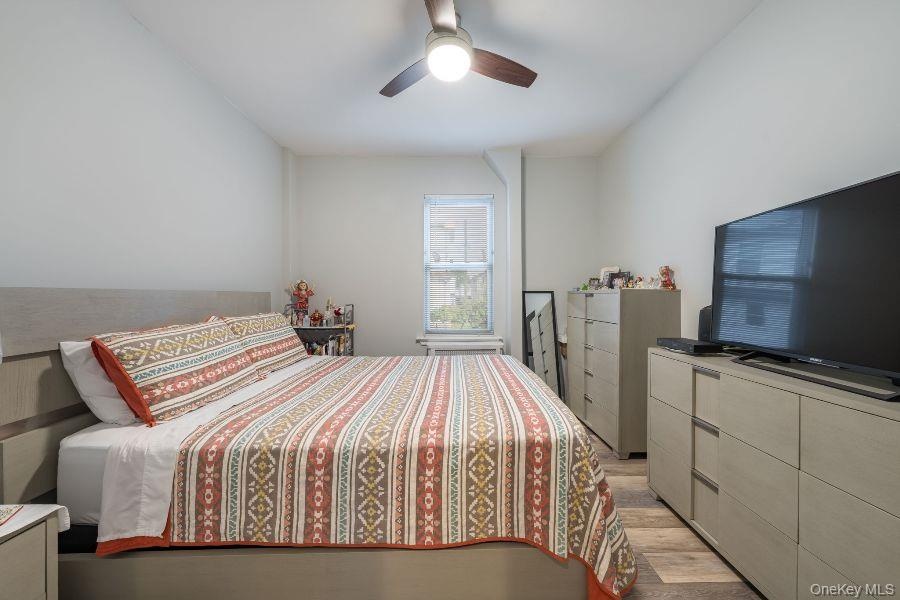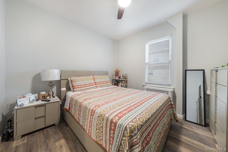 - Bedroom with dark wood-style flooring, ceiling fan, and radiator heating unit