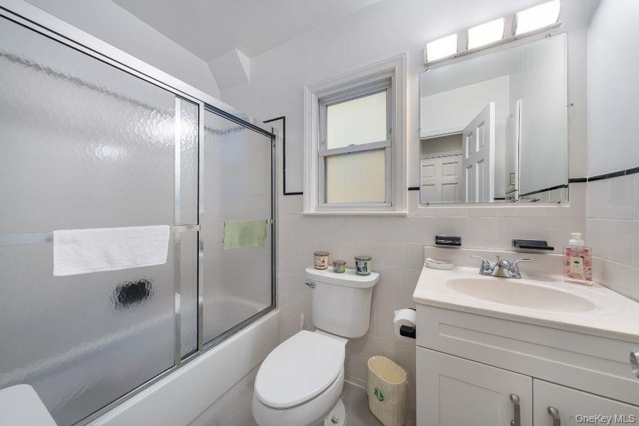 - Bathroom with bath / shower combo with glass door, tile walls, and vanity
