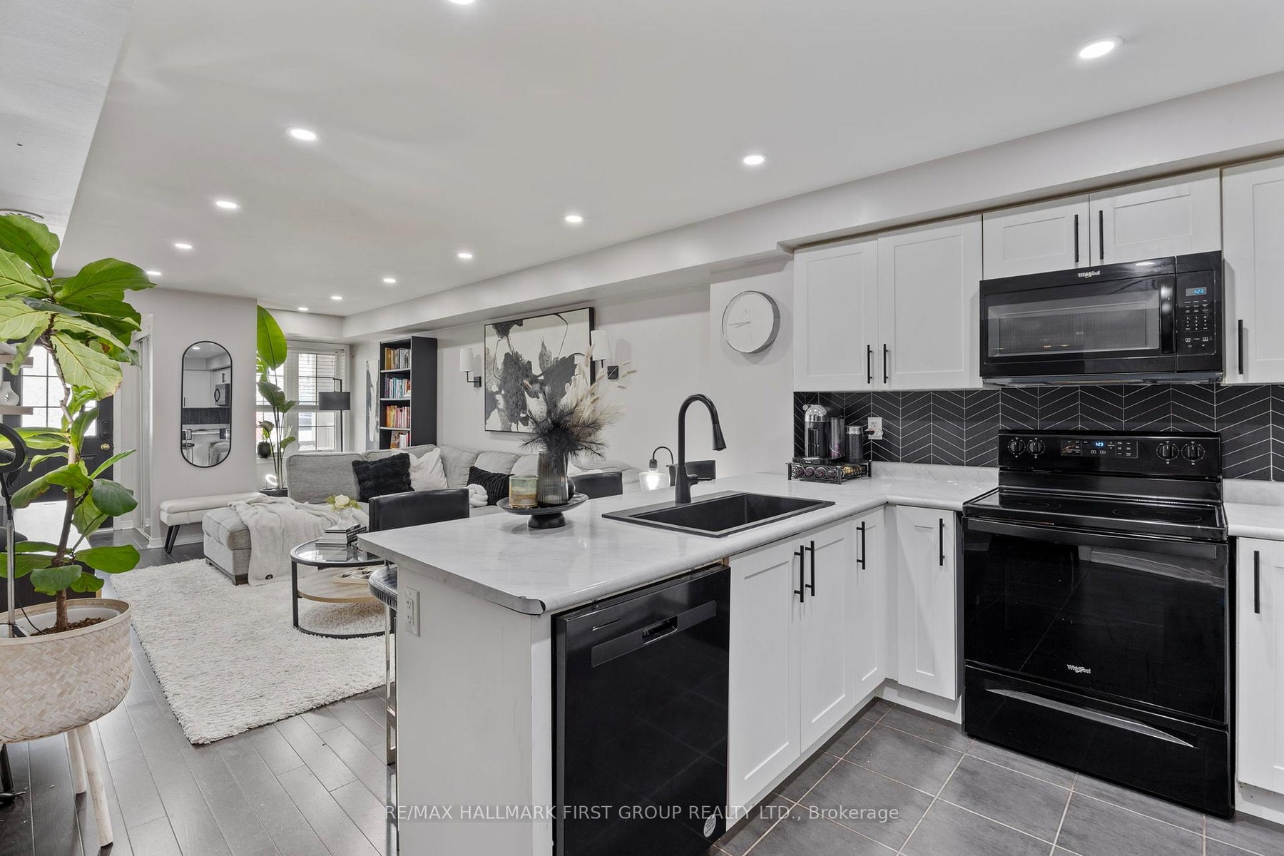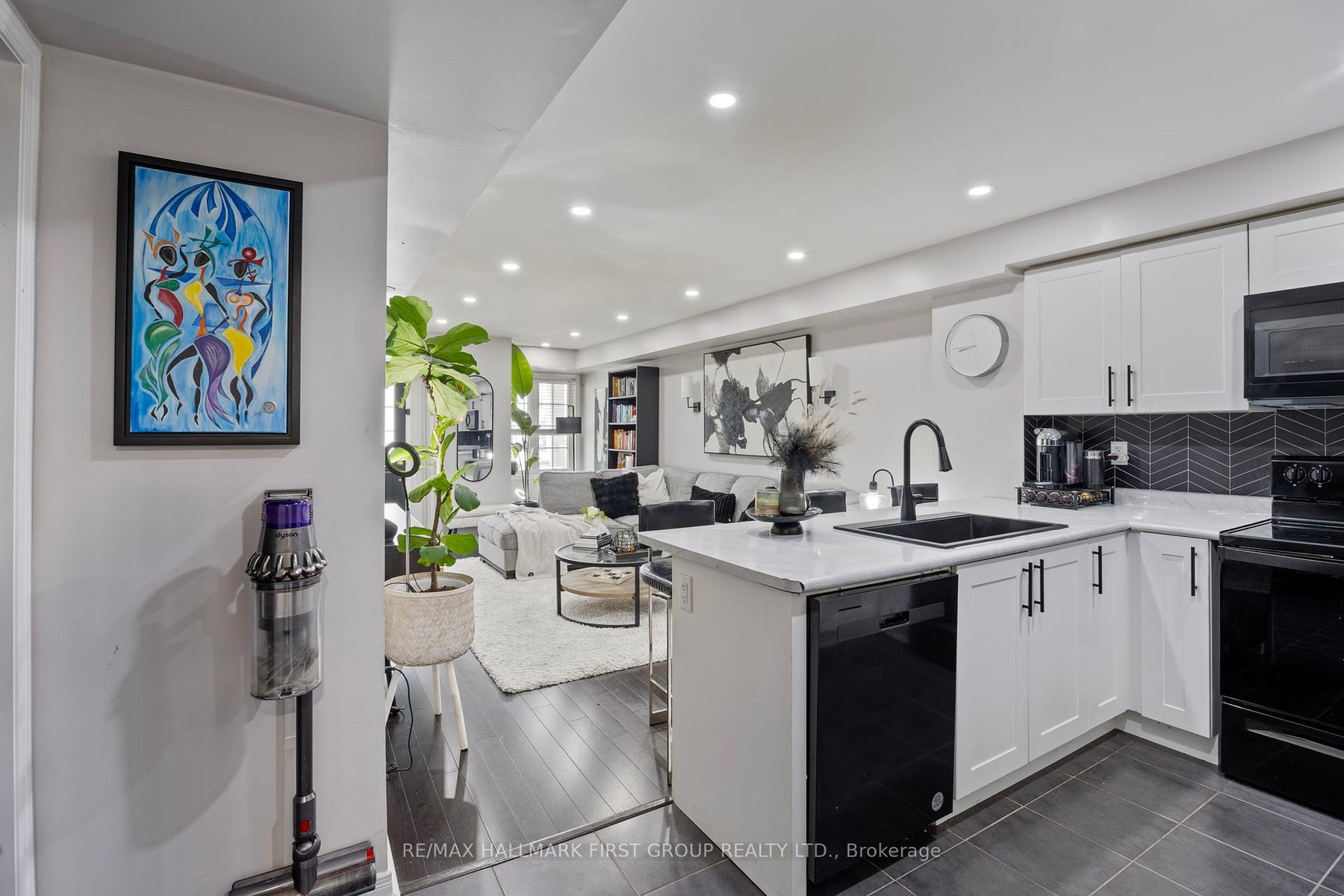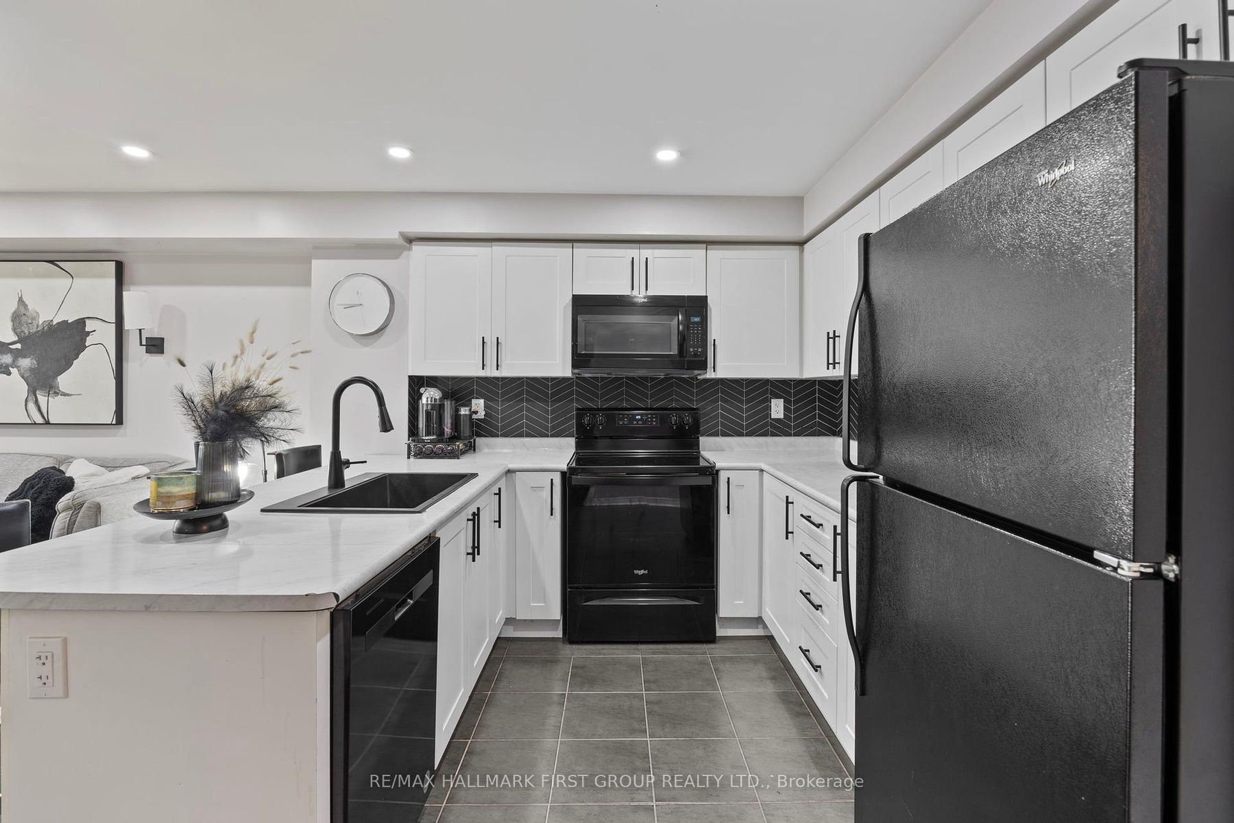 This modern 2 bedroom, 1 bathroom stacked condo townhouse offers sleek black finishes, hardwood floors, pot lights, and a stylish kitchen with stainless steel appliances, a sleek backsplash, and updated ...