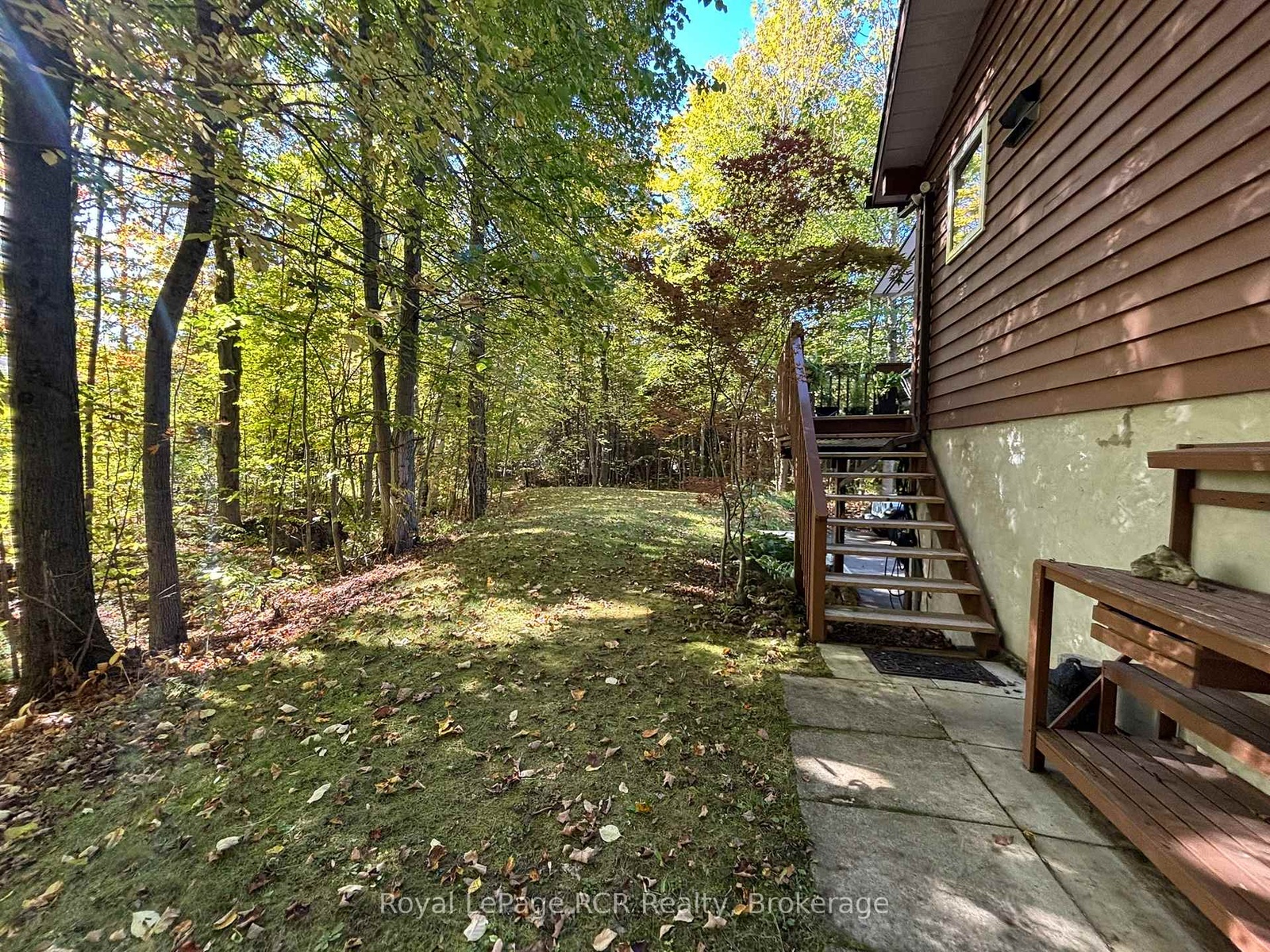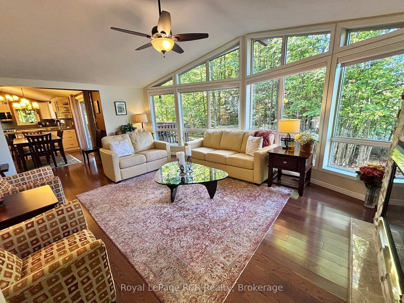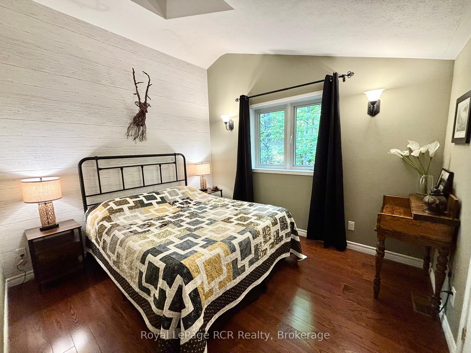 Private 5-Bedroom Home Nestled Among the Trees, and located in a highly sought after area! Escape to your own private oasis with this stunning 5-bedroom, 2-bathroom home, perfectly tucked away on a long, winding paved driveway. Surrounded by mature trees, this home cannot be seen from the road, offering seclusion and tranquility while still just minutes from town. Key features: bright, open-concept kitchen with granite counters. Dining room with walk-out to large deck with two awnings. Soaring vaulted ceilings, a natural gas fireplace and wall-to-wall windows that flood the Great room with natural light. A cozy lower-level family room with Built in speakers, and a second natural gas fireplace , perfect for movie nights. Multiple flex spaces ideal for hobbies, bedrooms, a home office, or a craft room. Enjoy peaceful mornings on the deck, evenings by the fire, and year-round privacy in a serene forest setting. Whether you're looking for a family home or a peaceful retreat in nature, this property offers the perfect balance of comfort, style, and seclusion. Don't miss the chance to own this hidden gem....a rare retreat that blends modern living with natural beauty. Located across the road from a Conservation Area, and short bike ride to the Georgian Bluffs Rail Trail. Fiber optic available. ****Many aspects of the home have been updated since 2009: Hot water tank, Water softener, AC unit (2009), All flooring in the home, both bathrooms fully redone (cabinets/ paint/ flooring/ fixtures), Blinds throughout, walls painted, ground floor fireplace, Granite counters in kitchen, Front deck (2020), Roof (2018) with heat cables in the valleys.
