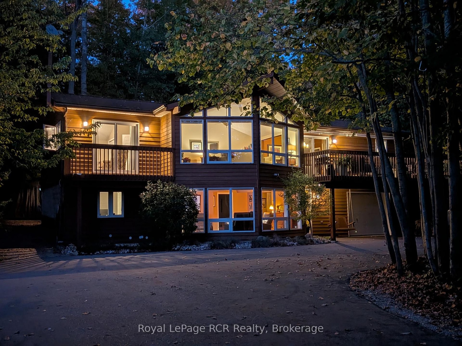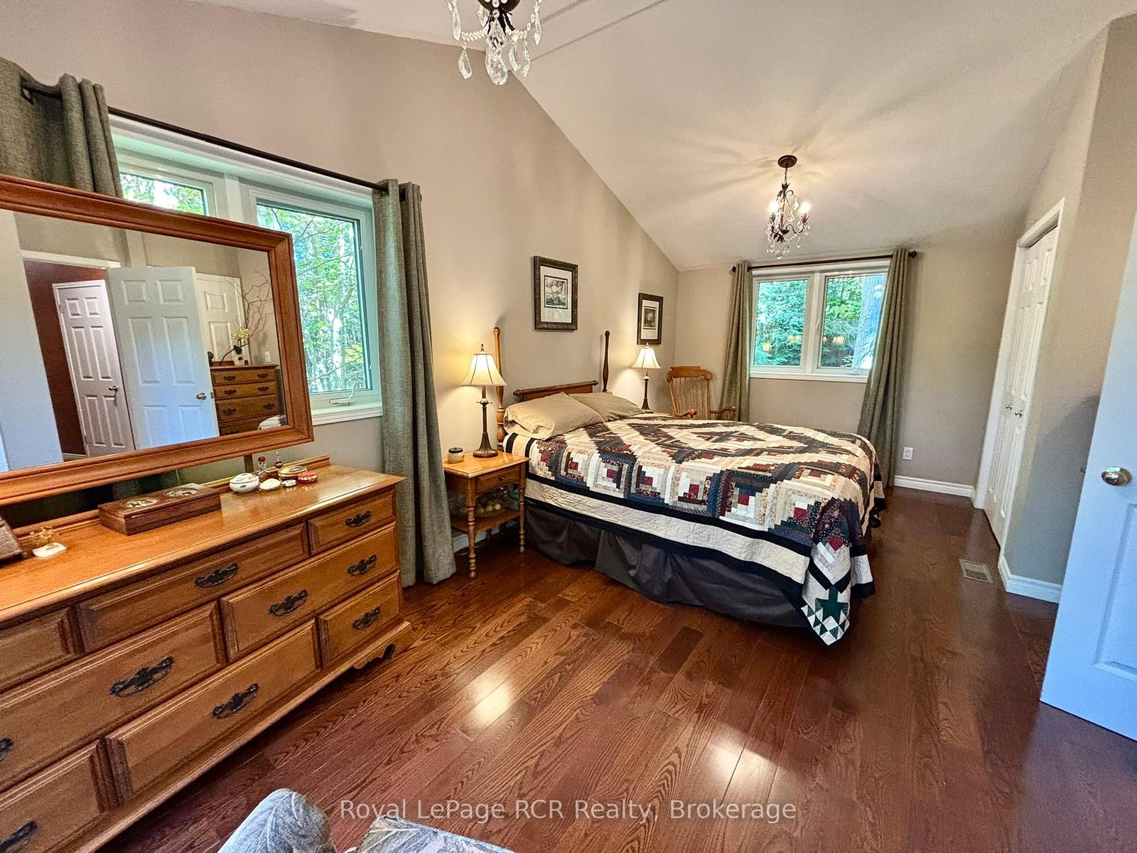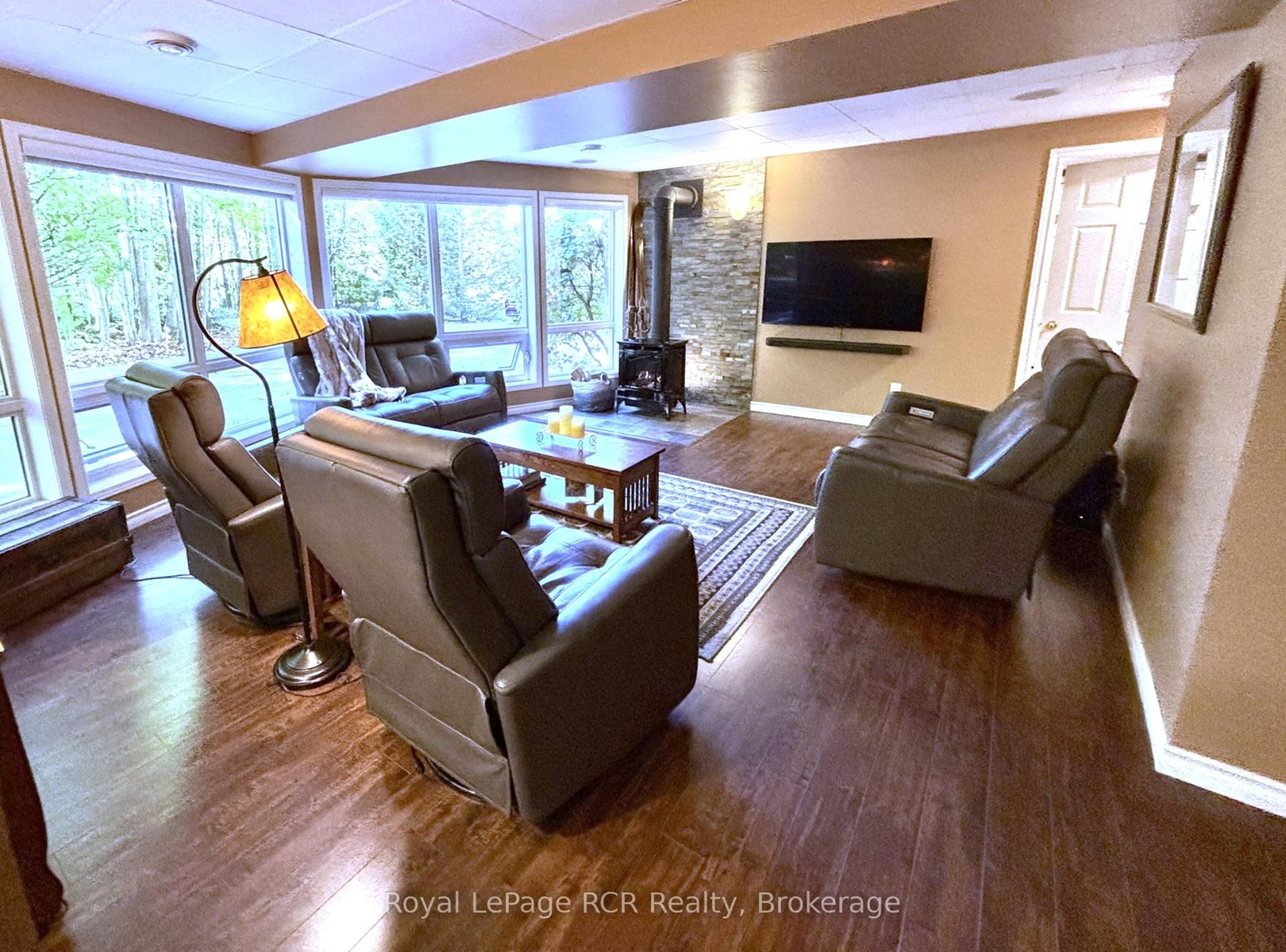 Private 5-Bedroom Home Nestled Among the Trees, and located in a highly sought after area! Escape to your own private oasis with this stunning 5-bedroom, 2-bathroom home, perfectly tucked away on a long, winding paved driveway. Surrounded by mature trees, this home cannot be seen from the road, offering seclusion and tranquility while still just minutes from town. Key features: bright, open-concept kitchen with granite counters. Dining room with walk-out to large deck with two awnings. Soaring vaulted ceilings, a natural gas fireplace and wall-to-wall windows that flood the Great room with natural light. A cozy lower-level family room with Built in speakers, and a second natural gas fireplace , perfect for movie nights. Multiple flex spaces ideal for hobbies, bedrooms, a home office, or a craft room. Enjoy peaceful mornings on the deck, evenings by the fire, and year-round privacy in a serene forest setting. Whether you're looking for a family home or a peaceful retreat in nature, this property offers the perfect balance of comfort, style, and seclusion. Don't miss the chance to own this hidden gem....a rare retreat that blends modern living with natural beauty. Located across the road from a Conservation Area, and short bike ride to the Georgian Bluffs Rail Trail. Fiber optic available. ****Many aspects of the home have been updated since 2009: Hot water tank, Water softener, AC unit (2009), All flooring in the home, both bathrooms fully redone (cabinets/ paint/ flooring/ fixtures), Blinds throughout, walls painted, ground floor fireplace, Granite counters in kitchen, Front deck (2020), Roof (2018) with heat cables in the valleys.