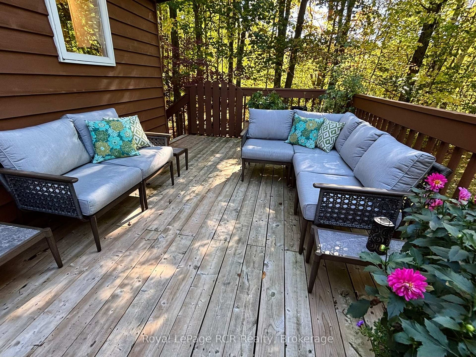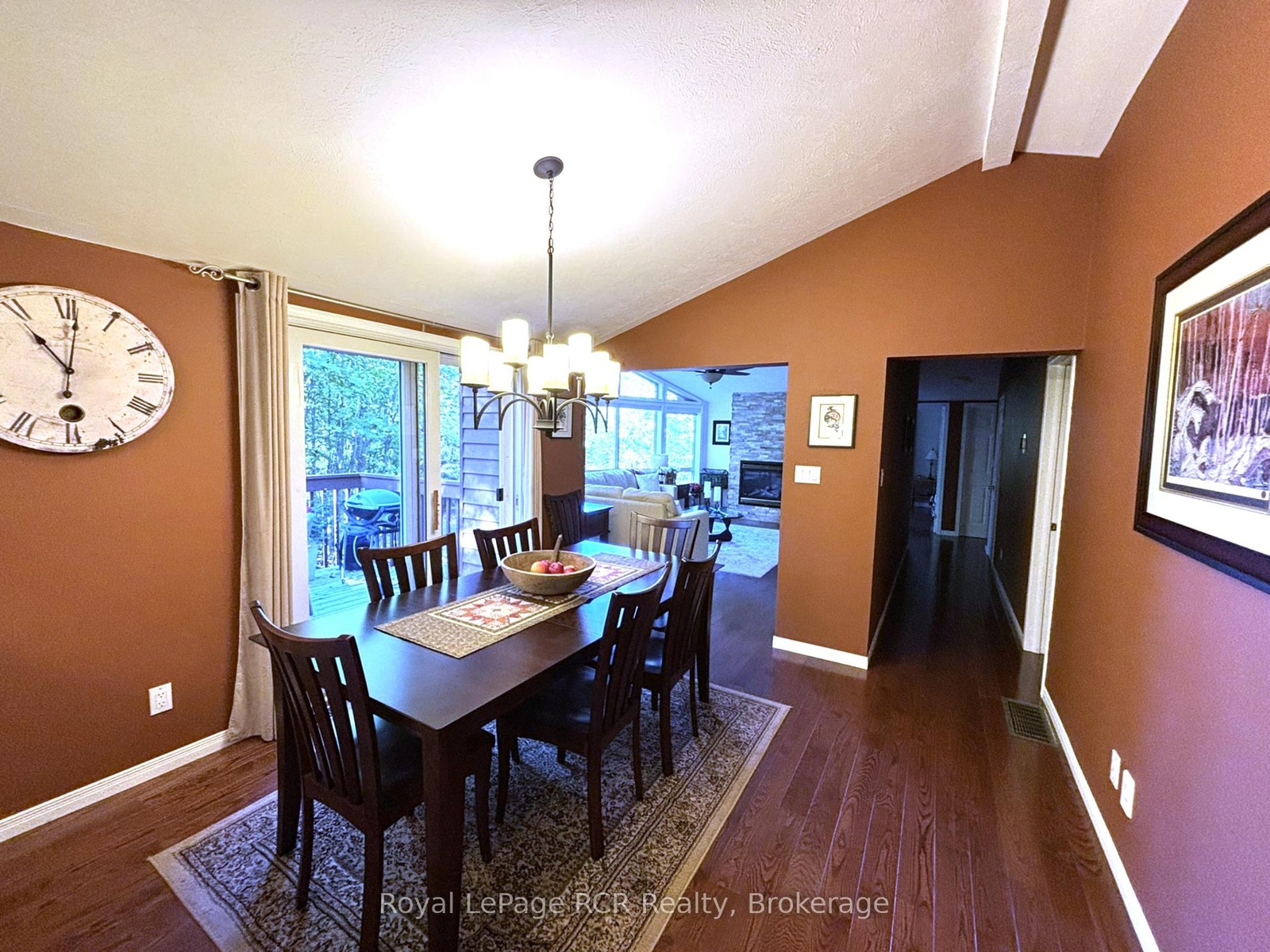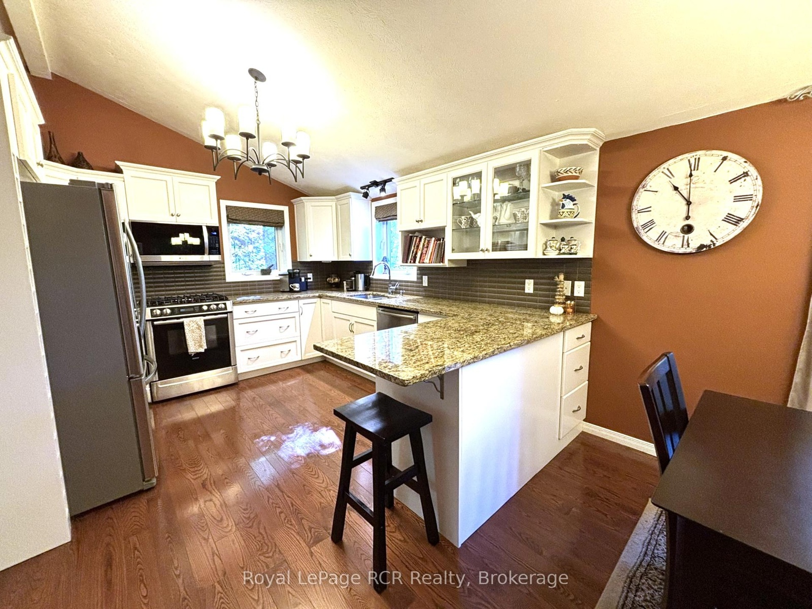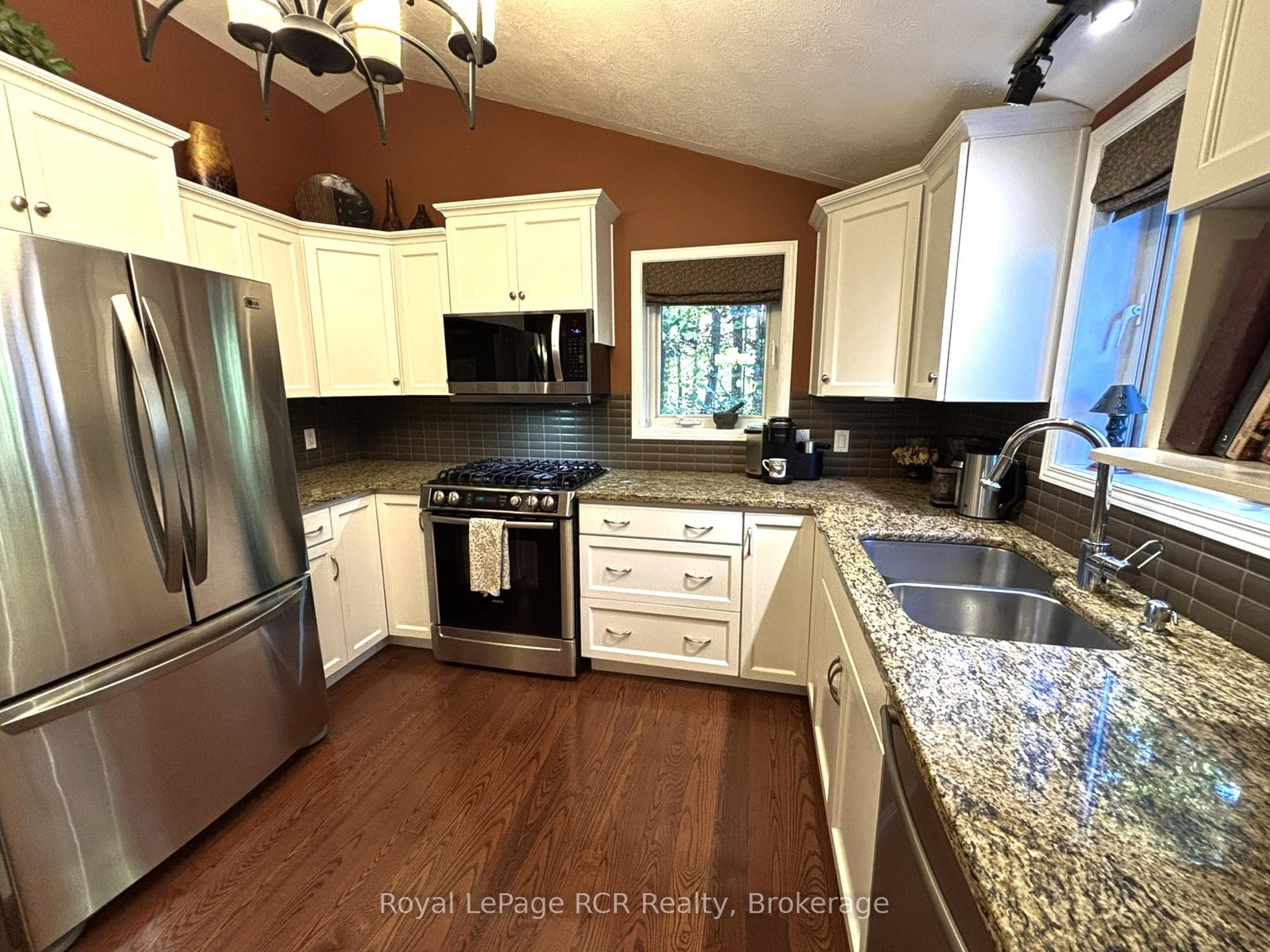 DescriptionPrivate 5-Bedroom Home Nestled Among the Trees, and located in a highly sought after area! Escape to your own private oasis with this stunning 5-bedroom, 2-bathroom home, perfectly tucked away on a long, winding paved driveway. Surrounded by mature trees, this home cannot be seen from the road, offering seclusion and tranquility while still just minutes from town. Key features: bright, open-concept kitchen with granite counters. Dining room with walk-out to large deck with two awnings. Soaring vaulted ceilings, a natural gas fireplace and wall-to-wall windows that flood the Great room with natural light. A cozy lower-level family room with Built in speakers, and a second natural gas fireplace , perfect for movie nights. Multiple flex spaces ideal for hobbies, bedrooms, a home office, or a craft room. Enjoy peaceful mornings on the deck, evenings by the fire, and year-round privacy in a serene forest setting. Whether you're looking for a family home or a peaceful retreat in nature, this property offers the perfect balance of comfort, style, and seclusion. Don't miss the chance to own this hidden gem....a rare retreat that blends modern living with natural beauty. Located across the road from a Conservation Area, and short bike ride to the Georgian Bluffs Rail Trail. Fiber optic available. ****Many aspects of the home have been updated since 2009: Hot water tank, Water softener, AC unit (2009), All flooring in the home, both bathrooms fully redone (cabinets/ paint/ flooring/ fixtures), Blinds throughout, walls painted, ground floor fireplace, Granite counters in kitchen, Front deck (2020), Roof (2018) with heat cables in the valleys.Amenities- Central Vacuum
