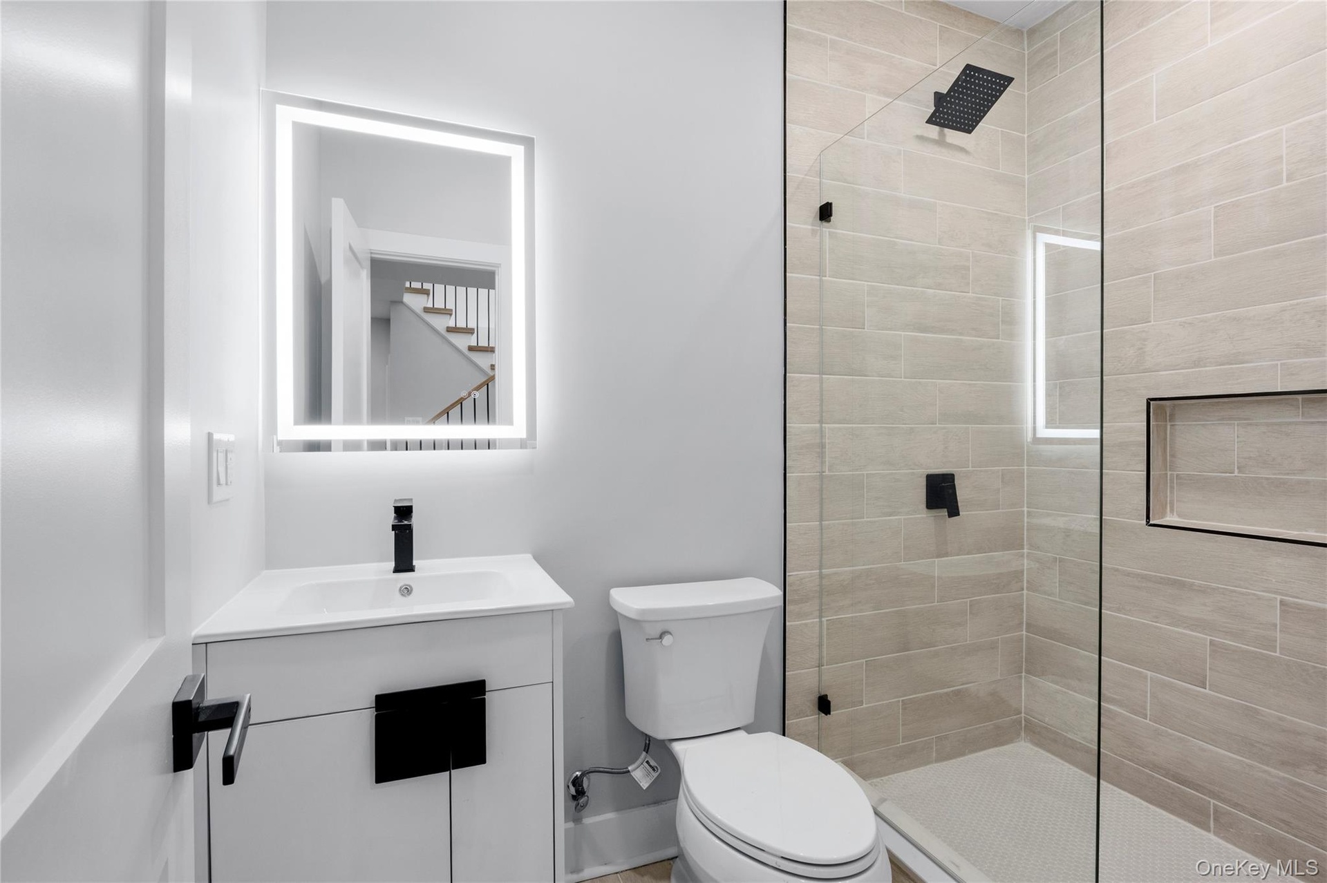 - Bathroom featuring a shower stall and vanity