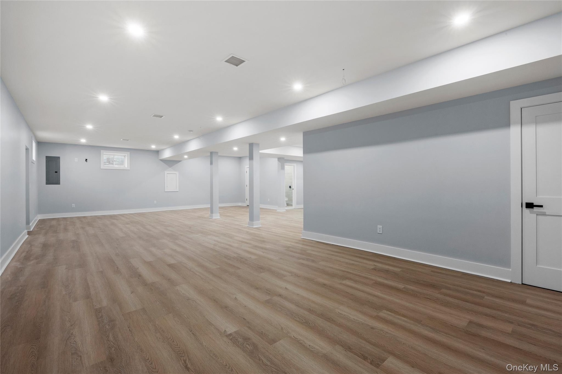 - Below grade area with recessed lighting, wood finished floors, and electric panel