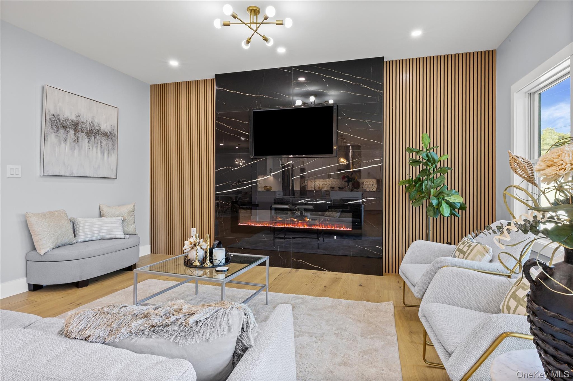 - Living room featuring an accent wall, light wood-type flooring, recessed lighting, a premium fireplace, and a chandelier