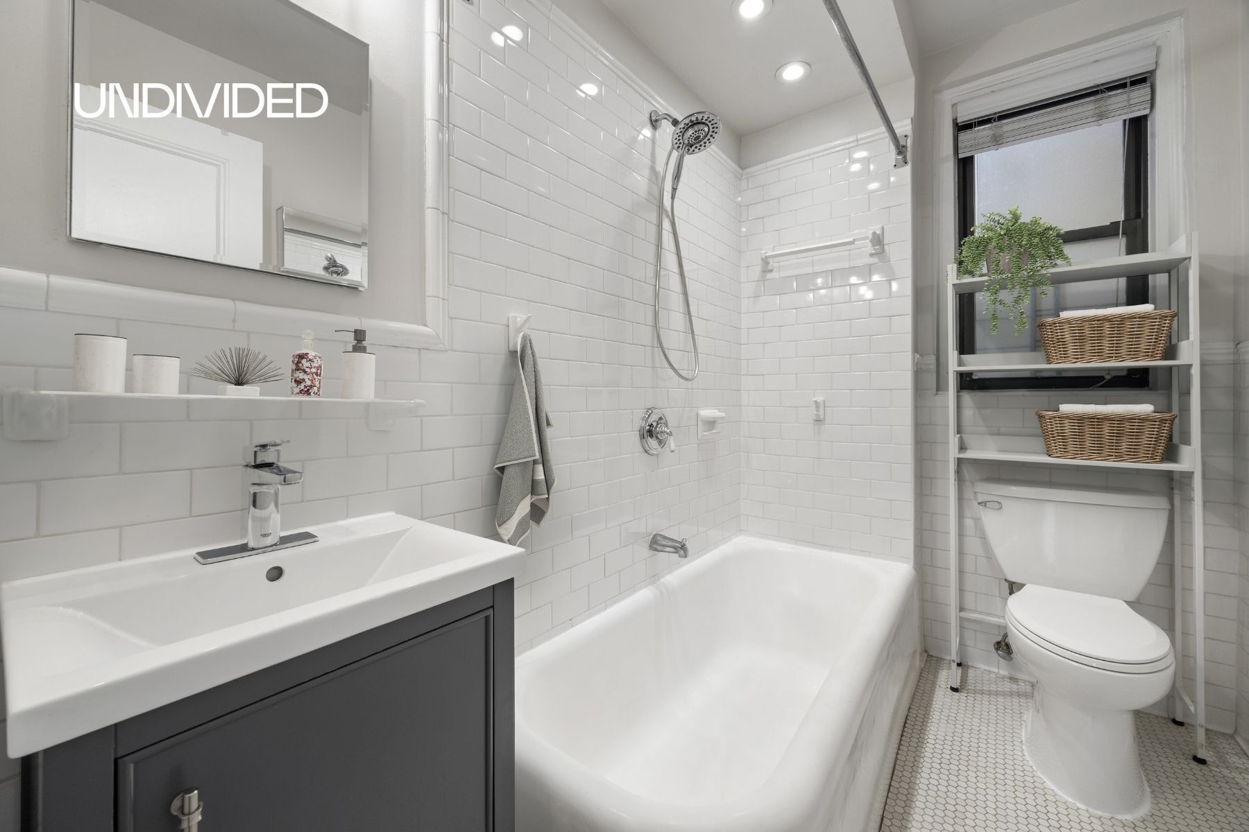 The windowed bathroom has also been thoughtfully updated with timeless finishes, including marble countertops, modern fixtures, and classic tilework.