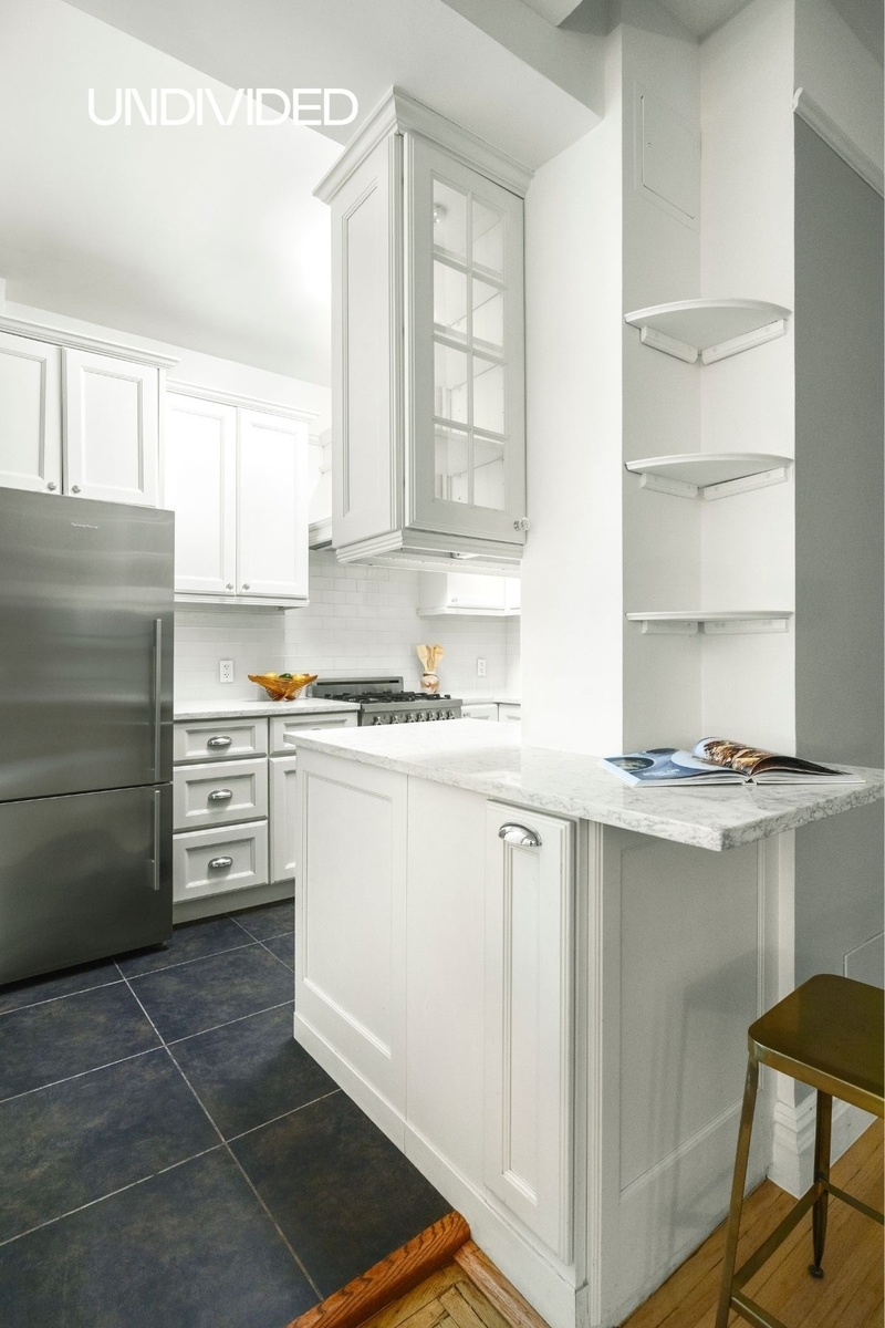 The kitchen has been fully renovated with marble countertops, stainless steel appliances, including a Bertazzoni oven and range, Fisher & Paykel refrigerator, and custom cabinetry designed to maximize both storage and efficiency. A breakfast bar offers a casual space for morning coffee or quick meals.
